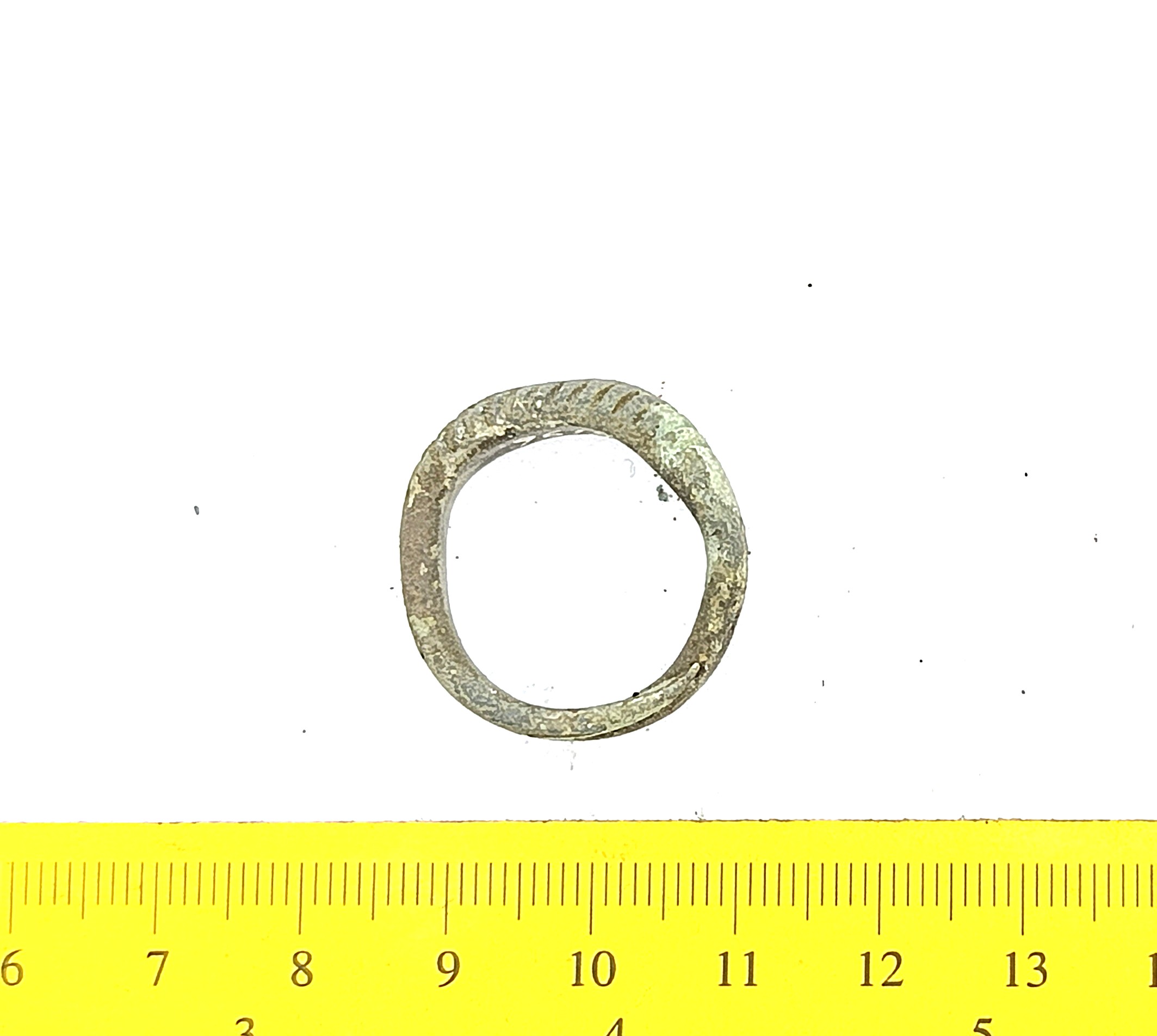 Pakseneva keskosaga põiki soonitud sõrmus, vasesulam.
