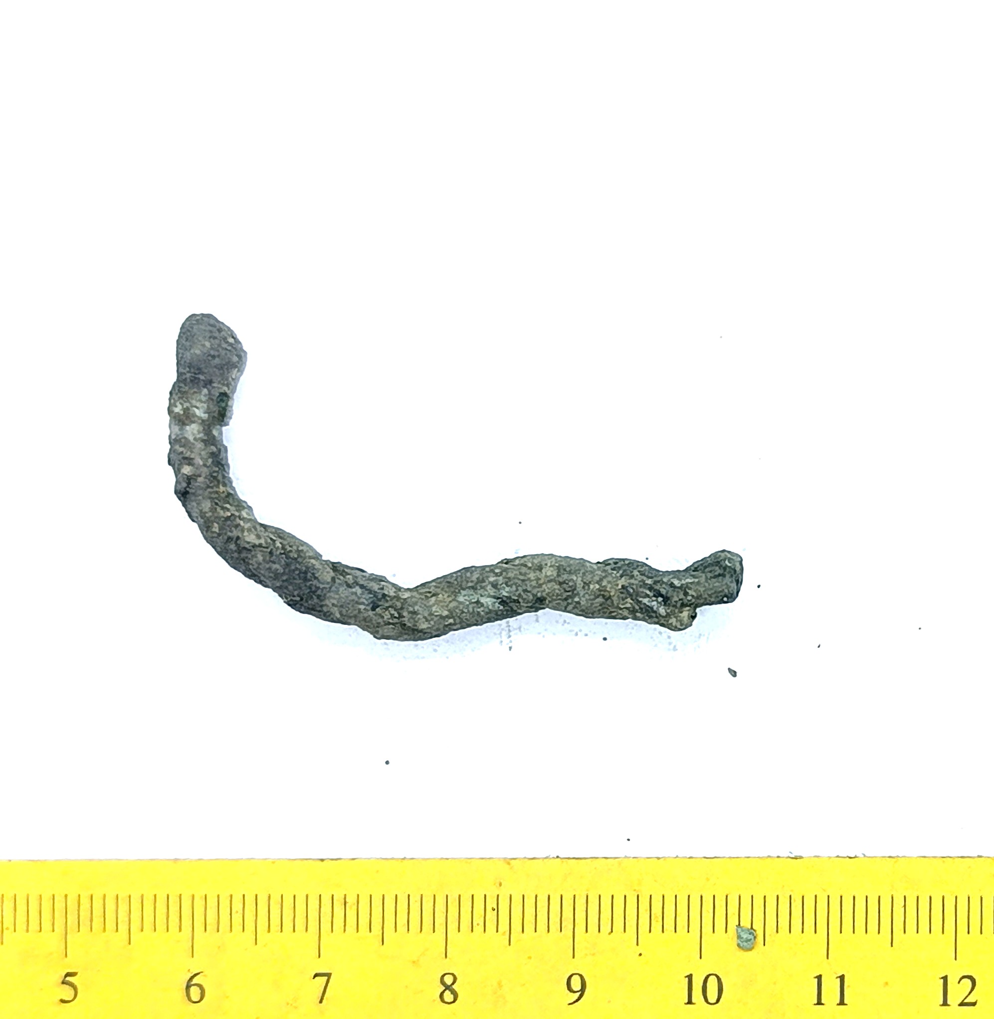 Punutud keti katked, 2, vasesulam. Peenikestest vasesulamtraatidest plett-tehnikas punutud kettide katked on kõrvutatud Karjala sarnaste leidudega (Ligi 1993, 50). Lätis ilmusid sellised ketid 12. sajandi lõpus ning olid kasutusel ka 13. sajandil (Zariņa 2006, 276; Spirģis 2008, 175).