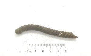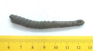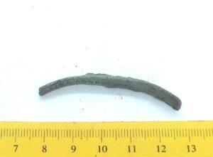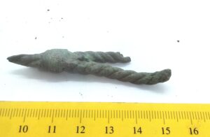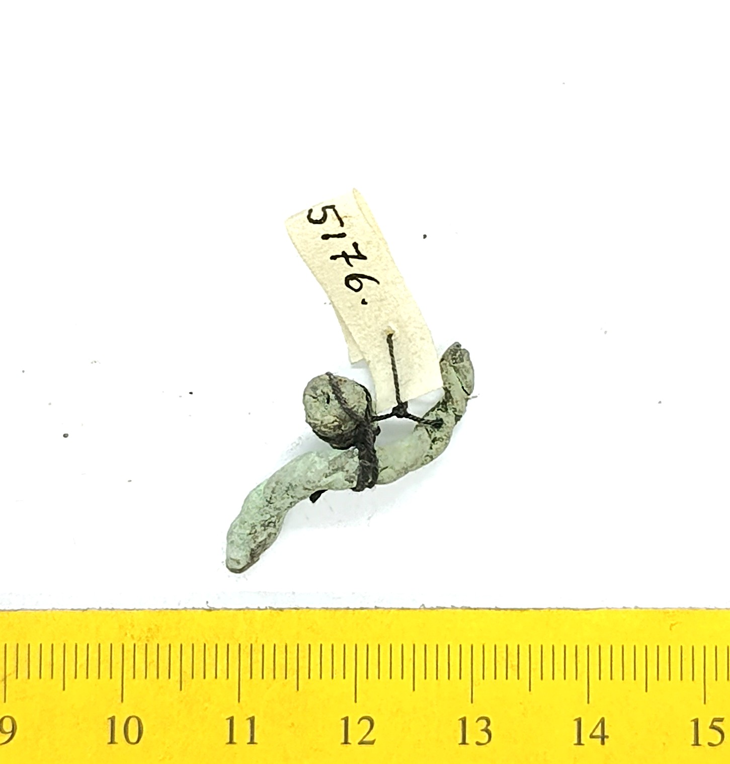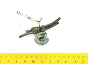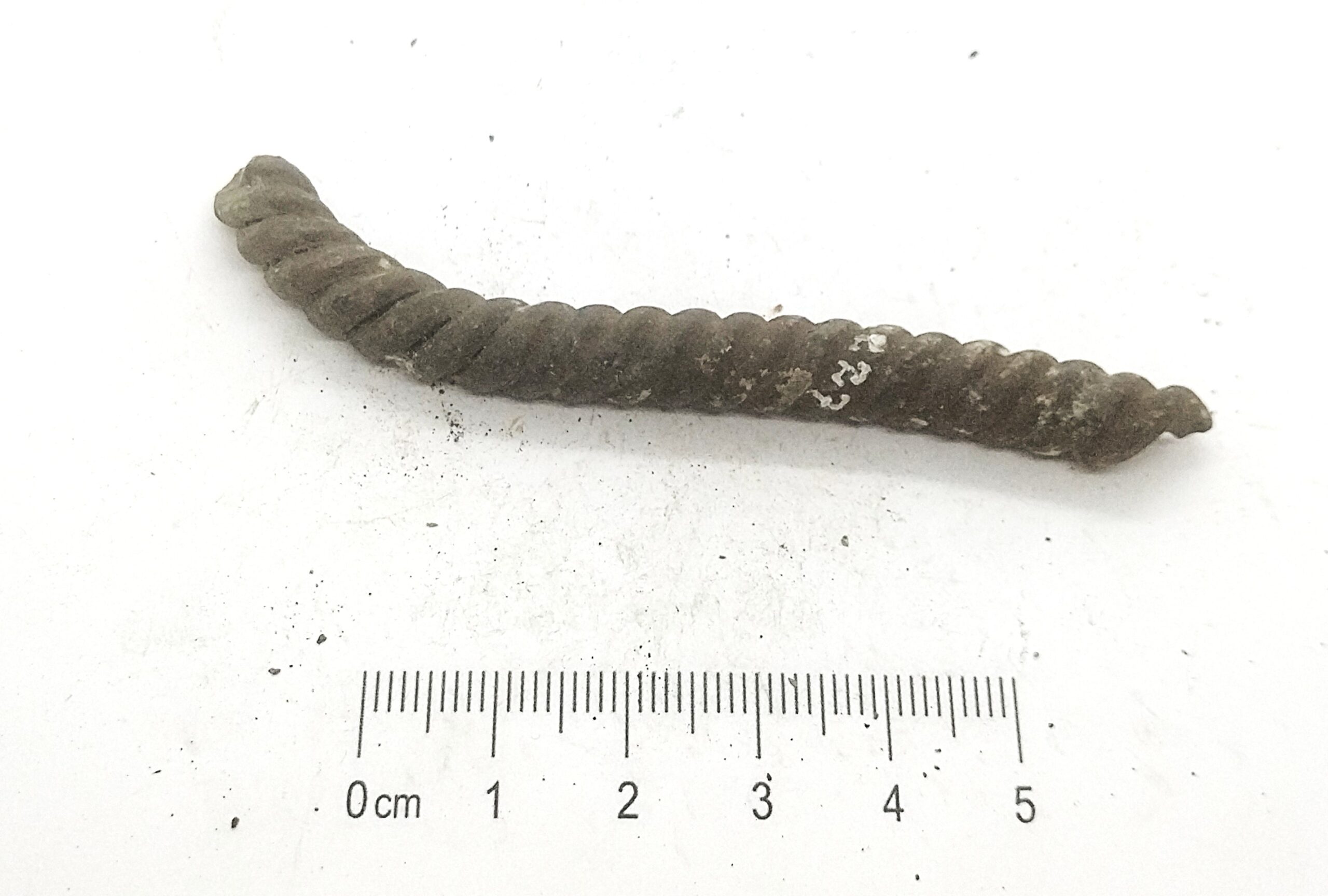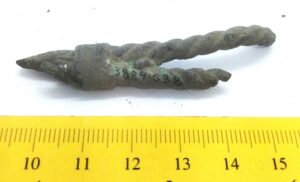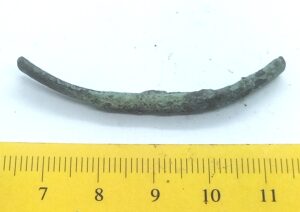 Kaelavõru katke, vasesulam, keeratud kolmest traadist. Sellistel kaelavõrudel oli tavaliselt kaks traatidest keeratud kaart, ühendatud haagiga. Neid on leitud laibamatustest (näiteks Loona, Valjala: Mägi 2002, tahv. 98: 1; Mägi et al 2019, 97), kuid selliseid katkeid on ka põletusmatustega kivikalmetes.