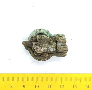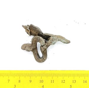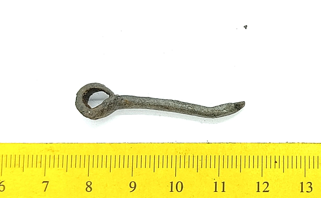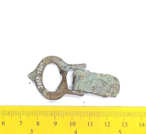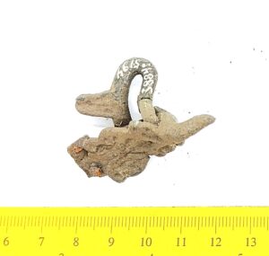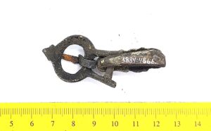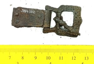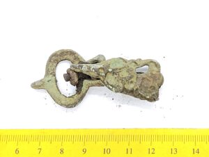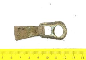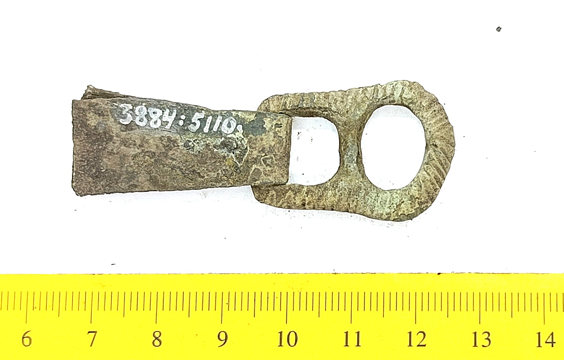 Stiliseeritud loomapeakujuline rihmakand, vasesulam. Sellised on Eesti, Sooma ja Läti rannikualade materjalis väga levinud (Jets 2012, 166-178). Need kuuluvad valdavalt 11.-12. sajandisse, kuigi võisid ilmuda juba 10. sajandi lõpus. Üksikuid selliseid rihmakandu on leitud ka 13. sajandi laibamatustest, kuid seal on need tõenäoliselt ülejäänud panustest vanemad esemed (nt. Mandel 2017, 39, tahv. X).