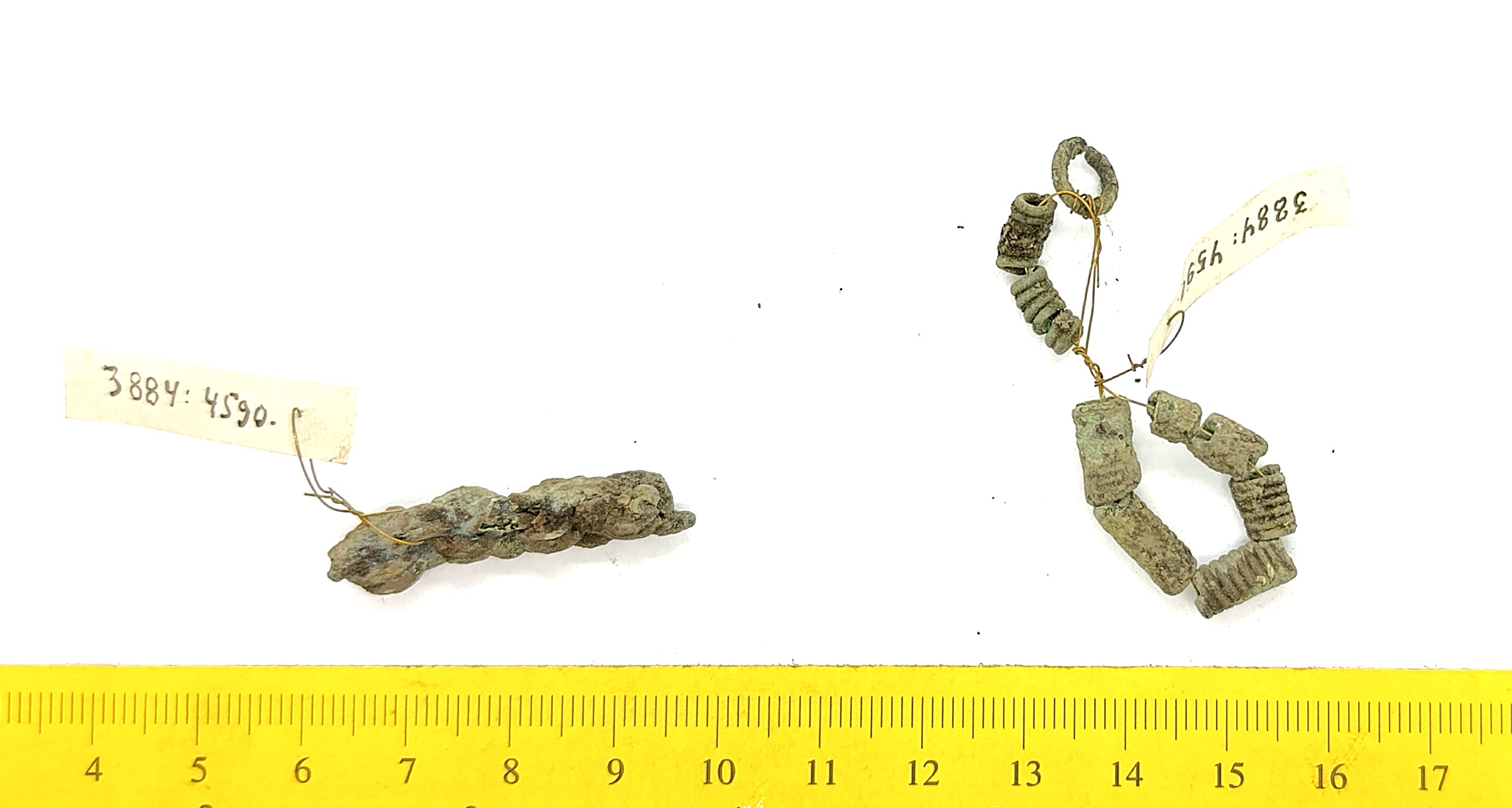 Kahekordsetest rõngaslülidest keti katked koos spiraaltorudega, vasesulam.