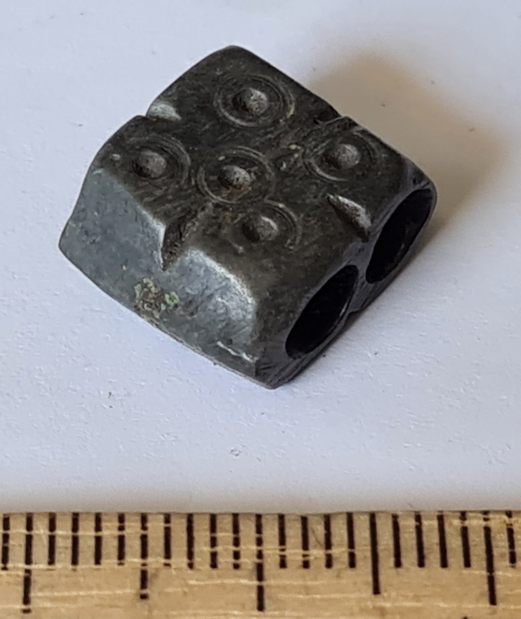 Kuudisekujuline vahelüli, vasesulam. Vahelülid hoidsid koos metallist rõngastest koosnevaid vöid, mida on leitud mitmetest 13. sajandi laibamatustest, näiteks Valjalast (Mägi et al 2019, 98–99). Vöökette on peamiselt leitud naiste ja laste matustest ning nii kette kui nendega kaasnevaid kuudisekujulisi vahelülisid on dateeritud 12.–13. sajandisse (Kurisoo et al. 2023, 220–221).