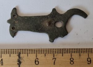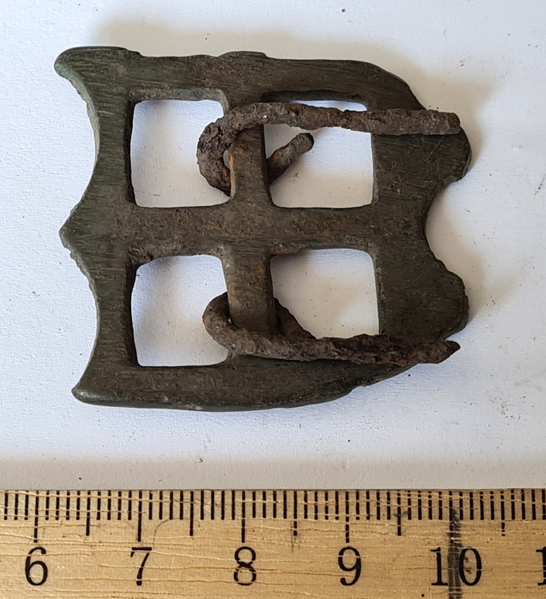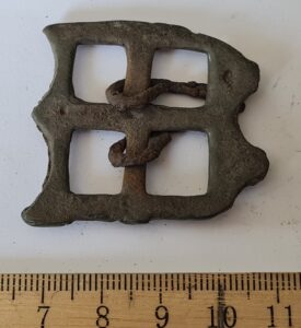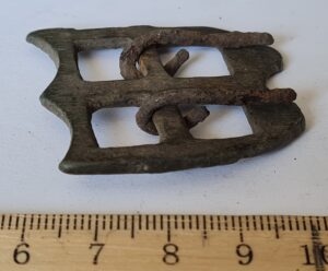 Stiliseeritud loomapeakujuline rihmakand, vasesulam. Sellised on Eesti, Soome ja Läti rannikualade materjalis väga levinud (Jets 2012, 166-178). Need kuuluvad valdavalt 11.-12. sajandisse, kuigi võisid ilmuda juba 10. sajandi lõpus. Üksikuid selliseid rihmakandu on leitud ka 13. sajandi laibamatustest, kuid seal on need tõenäoliselt ülejäänud panustest vanemad esemed (nt. Mandel 2017, 39, tahv. X).
