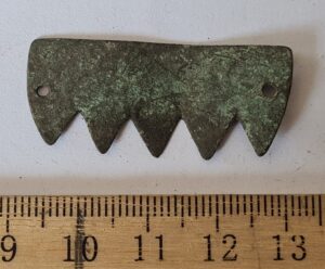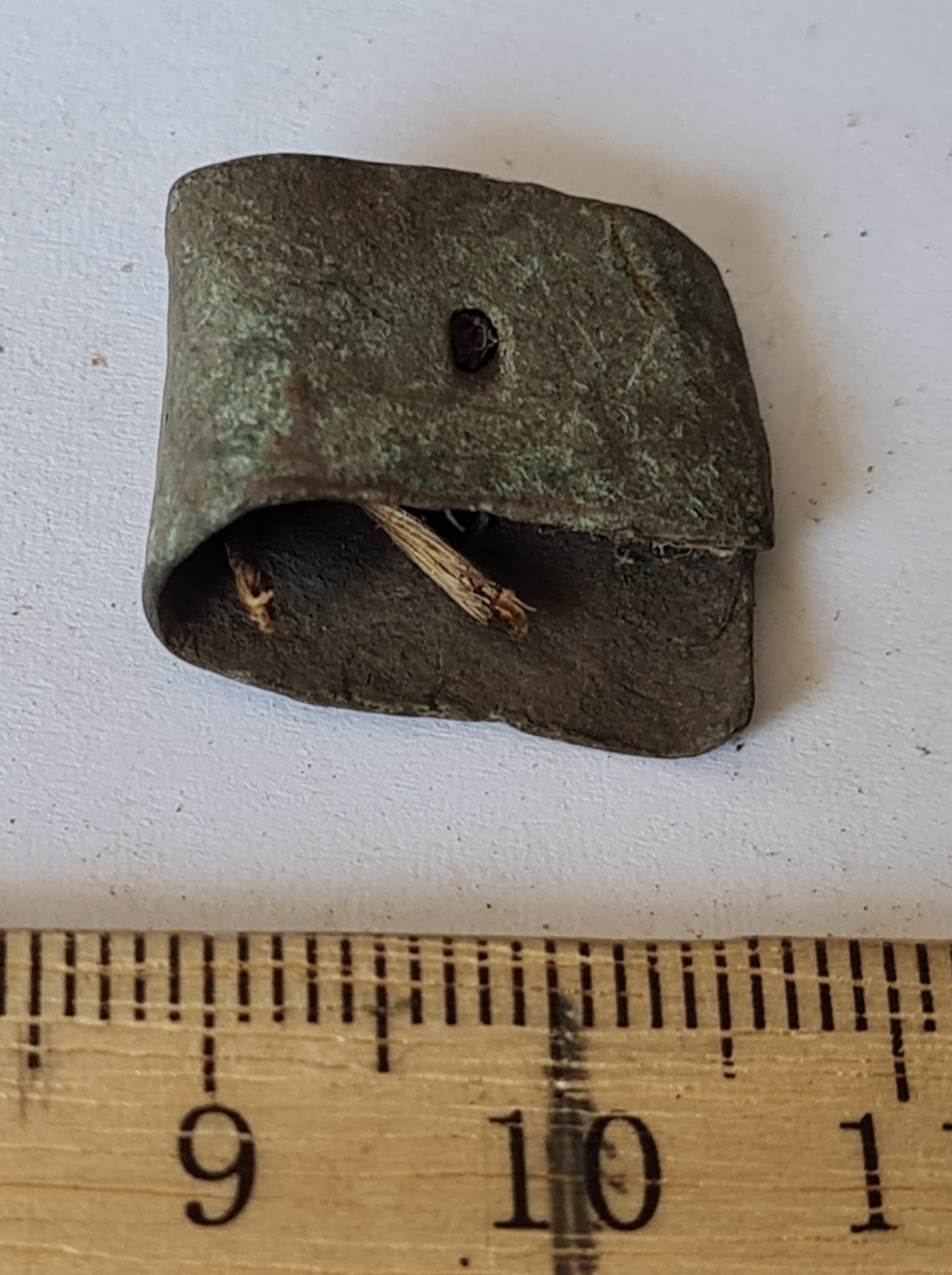 Rõivakaunistus, vasesulam. Pikerguse riba ots, ornamenditud reljeefsete ristide ja sõõridega. Tagaküljel aasad riide külge õmblemiseks.