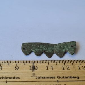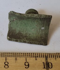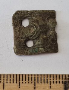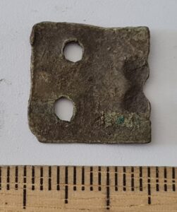 Naastu katke, vasesulam. Kahe ümmarguse kinnitusauguga, üks külg ornamenditud. Täpsemalt defineerimatu.