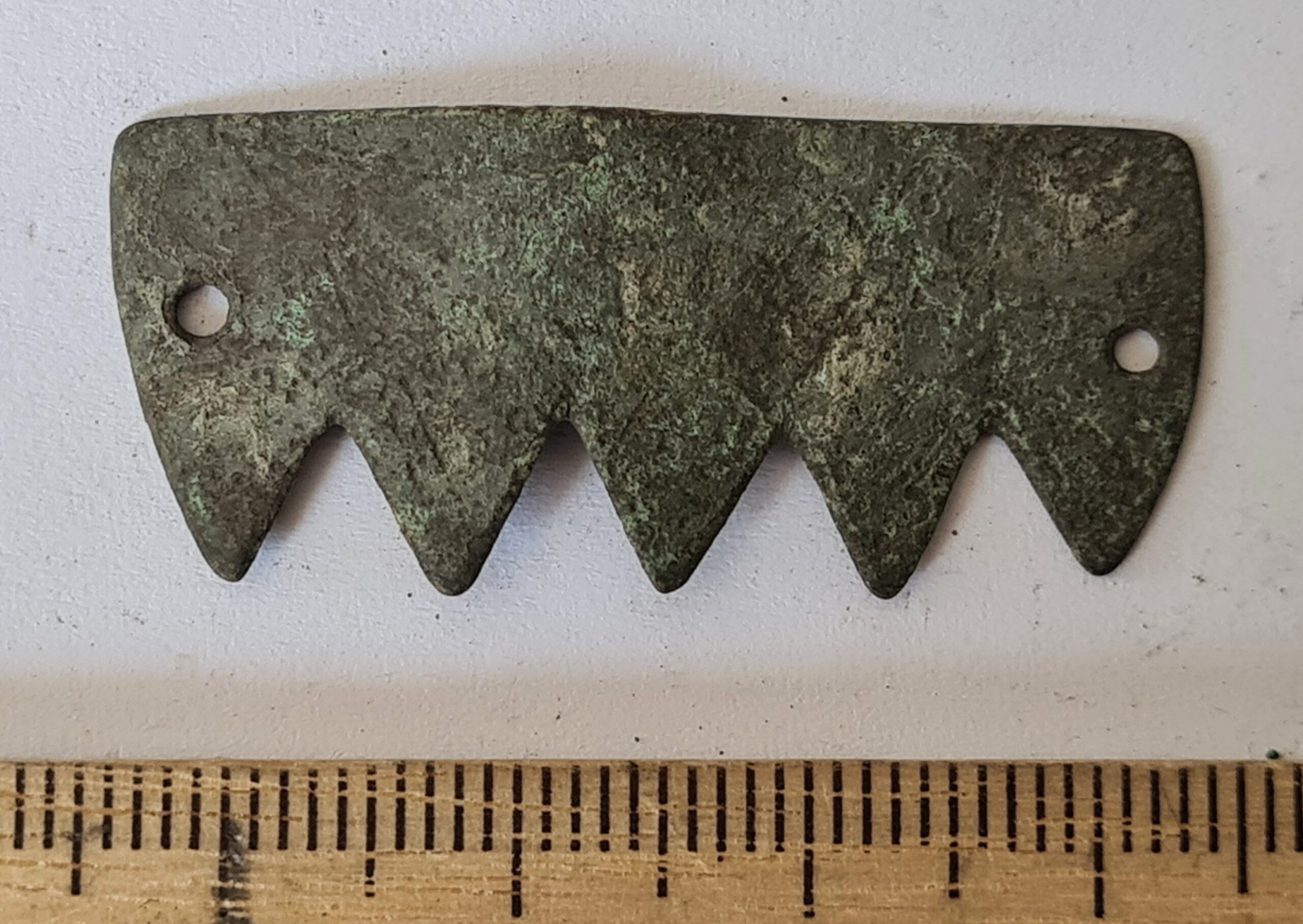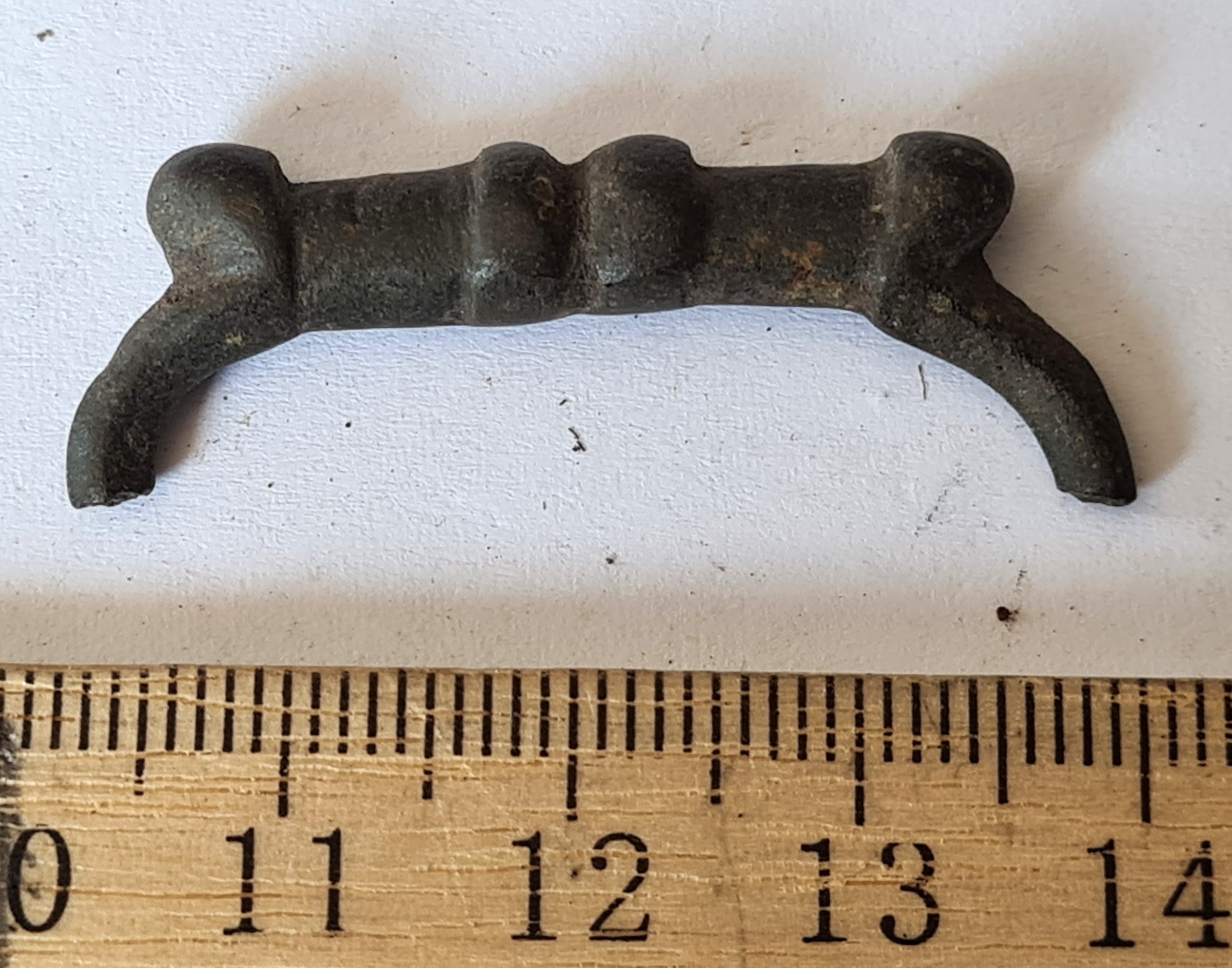 Naastu katke, vasesulam. Kahe ümmarguse kinnitusauguga, üks külg ornamenditud.