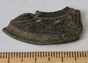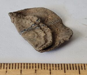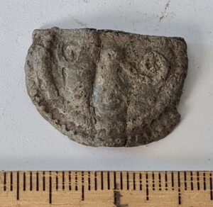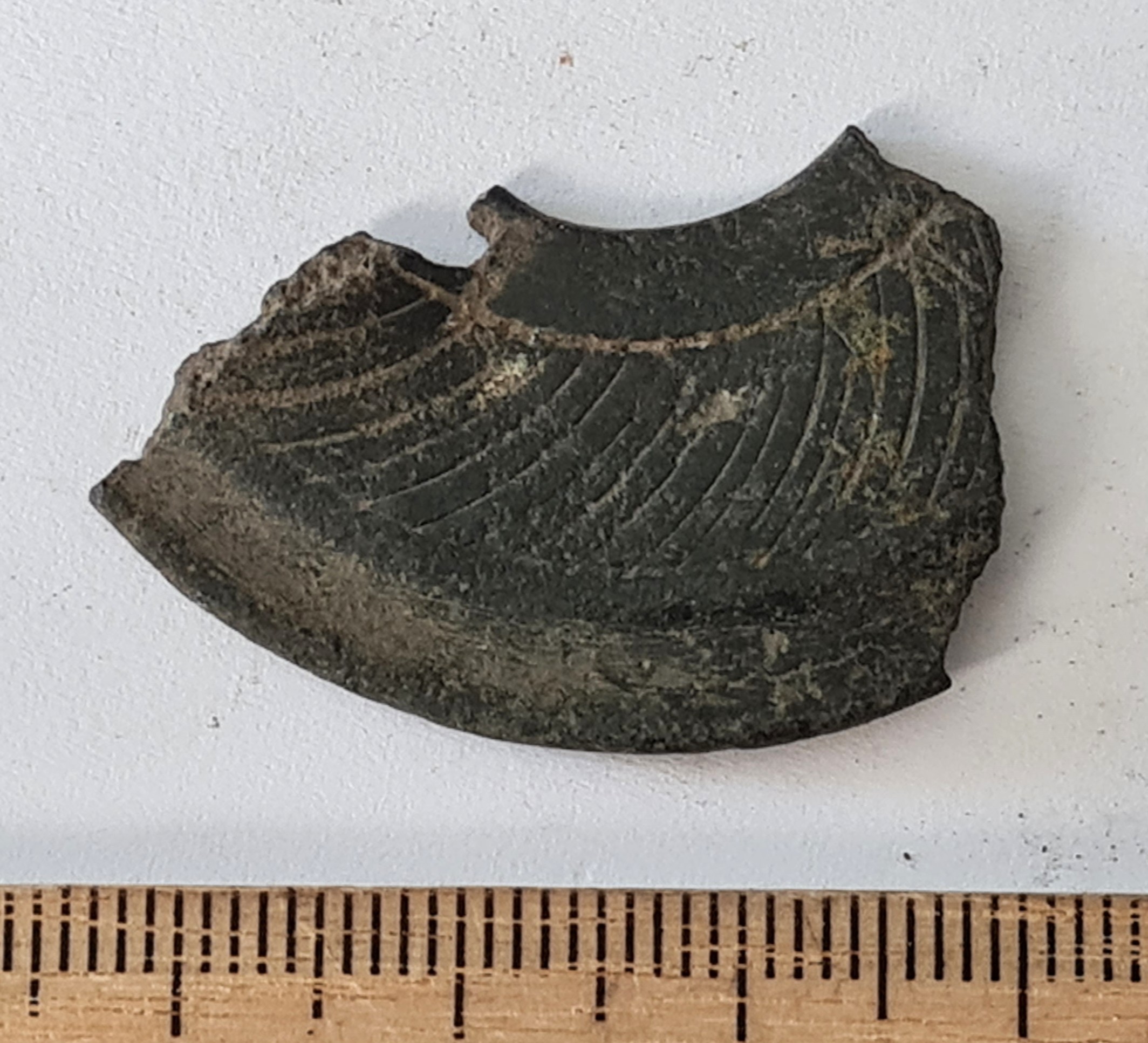 Rinnaleht, tina (?). Ümmargune, kokku murtud. Üks külg ornamenditud neljaharulise spiraaliga.