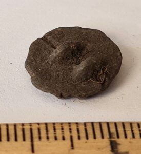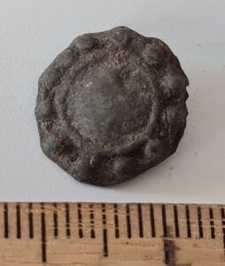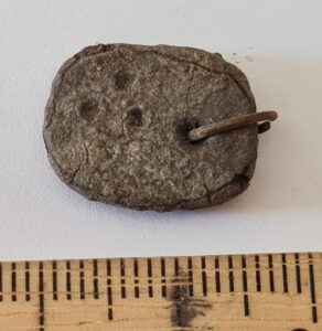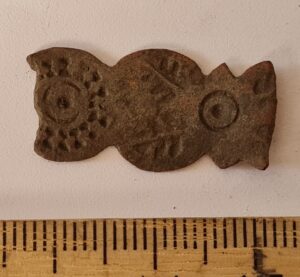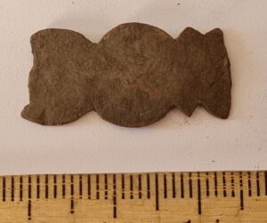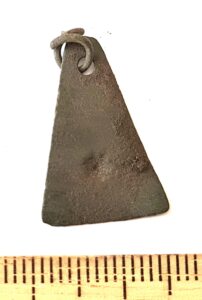 Ripats, vasesulam(?). Ovaalne, ühel küljel rist, teisel neli lohku. Läbi augu väike rõngas.