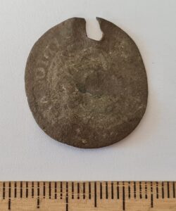 Ripats, vasesulam(?). Ovaalne, ühel küljel rist, teisel neli lohku. Läbi augu väike rõngas. Väga sarnane hõberipats, kuigi ilma ornamendita, on leitud näiteks Dundagas Vilkumuiźa matusest 2a, mis on dateeritud 13. sajandi lõppu või 14. sajandi algusesse (Muižnieks & Žeiere 2021, 191, 315).