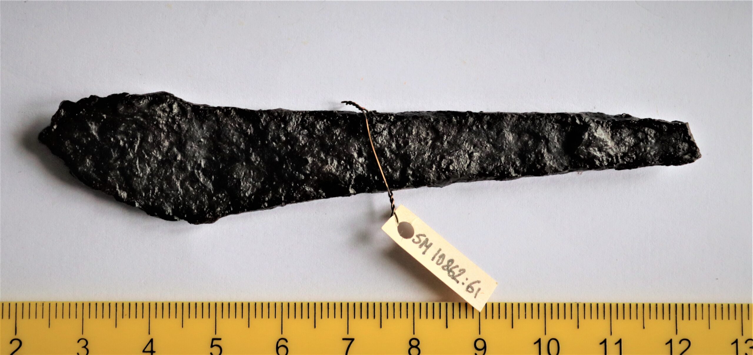 Nuga, raud. Selg veidi kumer, 6 mm lai. Rootsu ristlõige lame nelinurk, rootsu tipp murdunud.