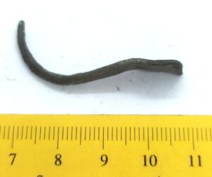 Õhukese laieneva keskosaga sõrmus, vasesulam. Sarnaseid sõrmuseid on leitud Eura Luistari ja Saramäki matustest Soomes, kus need dateeritakse 11. sajandisse (Lehtsalo-Hilander 1982, 124–126) ja Abelnieki matustest Lätis, kus need dateeritakse 11. sajandi II poolest kuni 13. sajandi alguseni (Vasks 2008, 157–158). Lisaks leidub selliseid sõrmuseid Ojamaal, kus need on dateeritud 11.-12. sajandisse (Thunmark-Nylen 1998, Tahv. 143; 2006, 158). Saaremaal on samasugune sõrmus leitud Valjala kirikaiast 13. sajandi või 12. sajandi päris lõpu kontekstist.