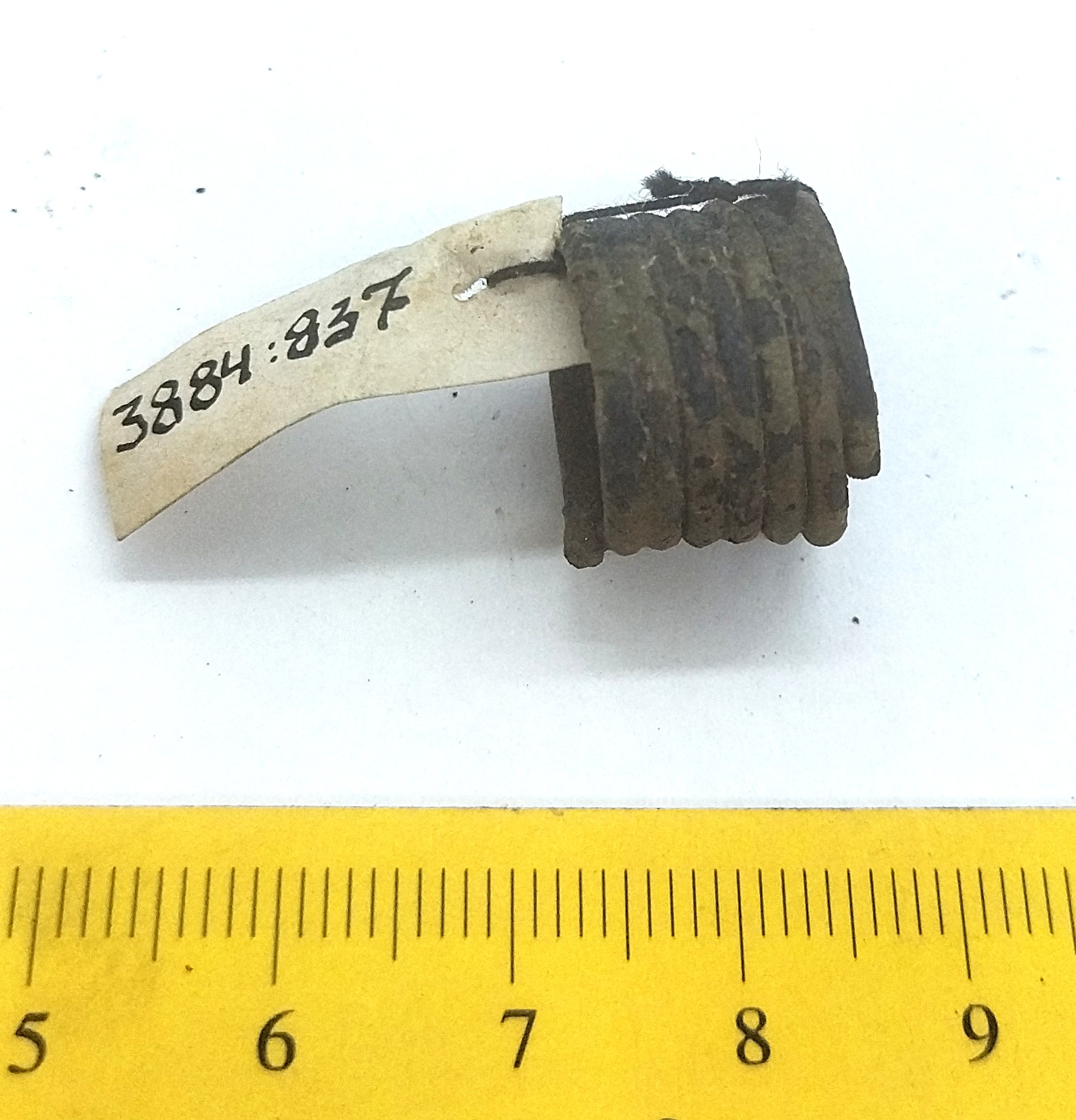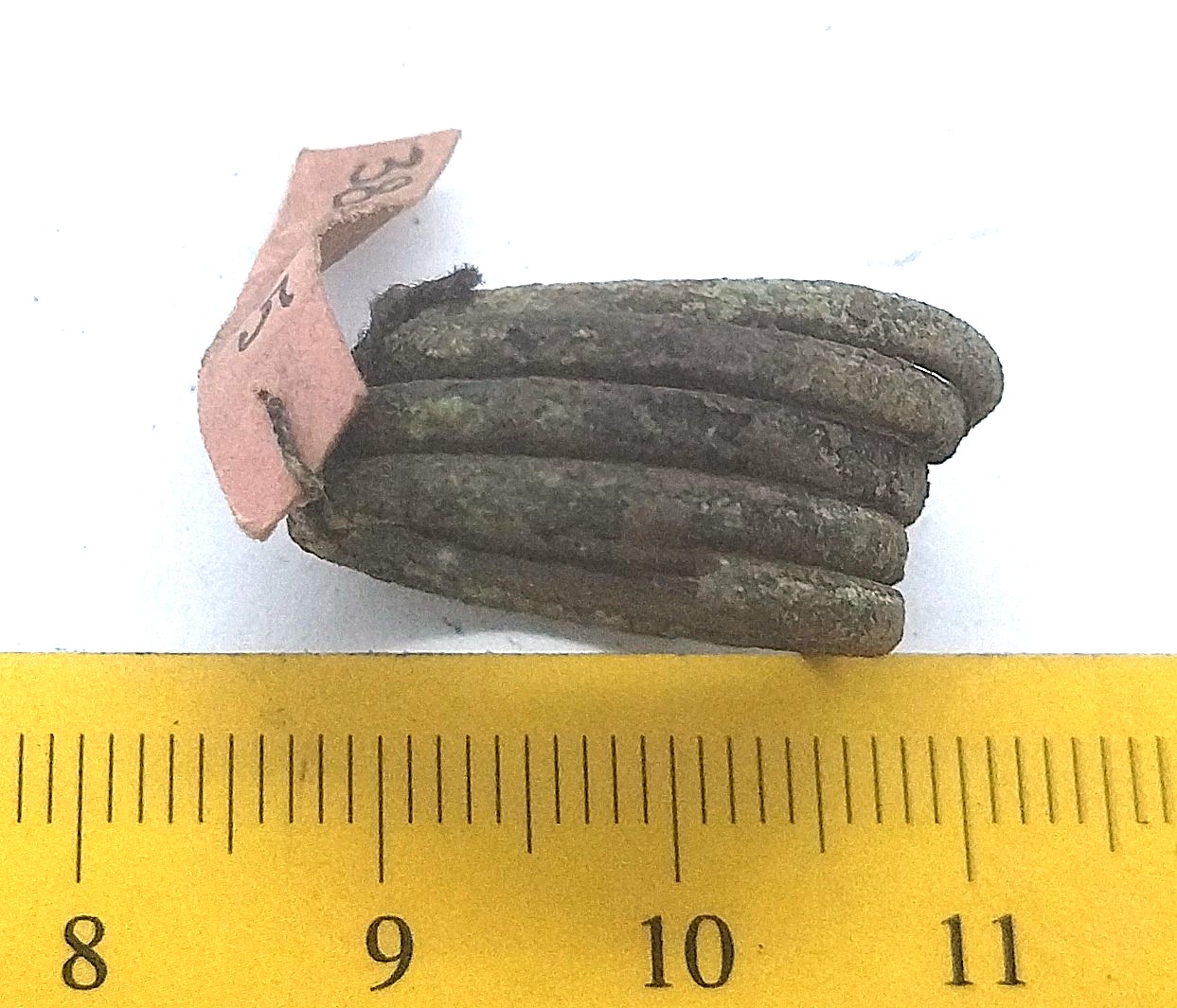 Õhukese laieneva keskosaga sõrmus, vasesulam. Sarnaseid sõrmuseid on leitud Eura Luistari ja Saramäki matustest Soomes, kus need dateeritakse 11. sajandisse (Lehtsalo-Hilander 1982, 124–126) ja Abelnieki matustest Lätis, kus need dateeritakse 11. sajandi II poolest kuni 13. sajandi alguseni (Vasks 2008, 157–158). Lisaks leidub selliseid sõrmuseid Ojamaal, kus need on dateeritud 11.-12. sajandisse (Thunmark-Nylen 1998, Tahv. 143; 2006, 158). Saaremaal on samasugune sõrmus leitud Valjala kirikaiast 13. sajandi või 12. sajandi päris lõpu kontekstist.