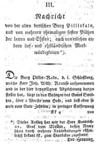 Mellin, L. A. (1794). Nachricht von der alten lettischen Burg Pilliskaln, und von mehrern ehemaligen festen Plätzen der Letten und Ehsten; auch von etlichen andern lief- und ehstländischen Merkwürdigkeiten. – Hupel, A. W. (edit). Neue Nordische Miscellaneen, 9-10, 519-545. Riga: Johann Friedrich Hartknoch.