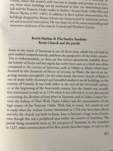 Markus, K., Sandrak, P. S. (2021). Karja Church and the parish (EST: Karja kirik ja kihelkond. 13. sajandi Saaremaa ajalugu ühe piirkonna perspektiivist). Saaremaa Muuseum. Kaheaastaraamat, 2019-2020, 37−63.