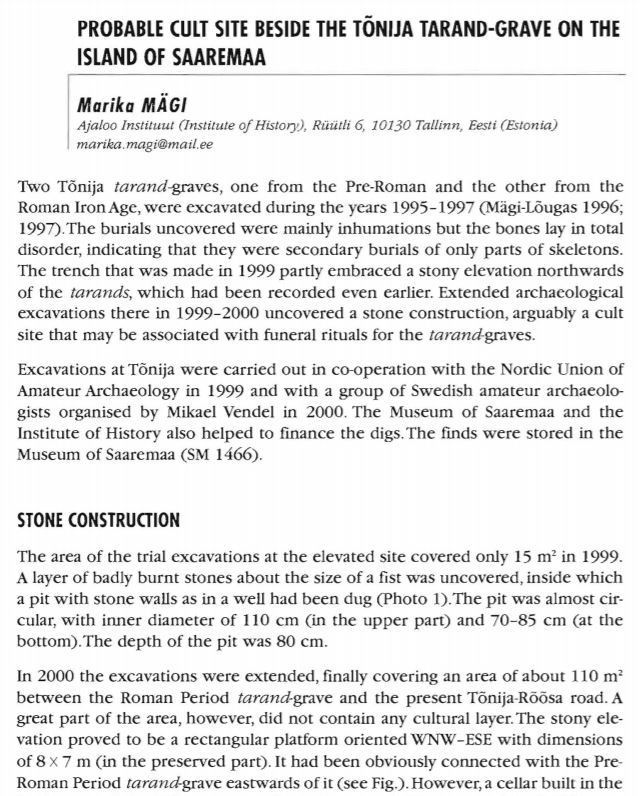 Mägi, M. (2001). Probable cult site beside the Tõnija tarand-grave on the Island of Saaremaa. In: Archaeological Fieldworks in Estonia = Arheoloogilised välitööd Eestis 2000 (48−55). Tallinn: Muinsuskaitseamet.