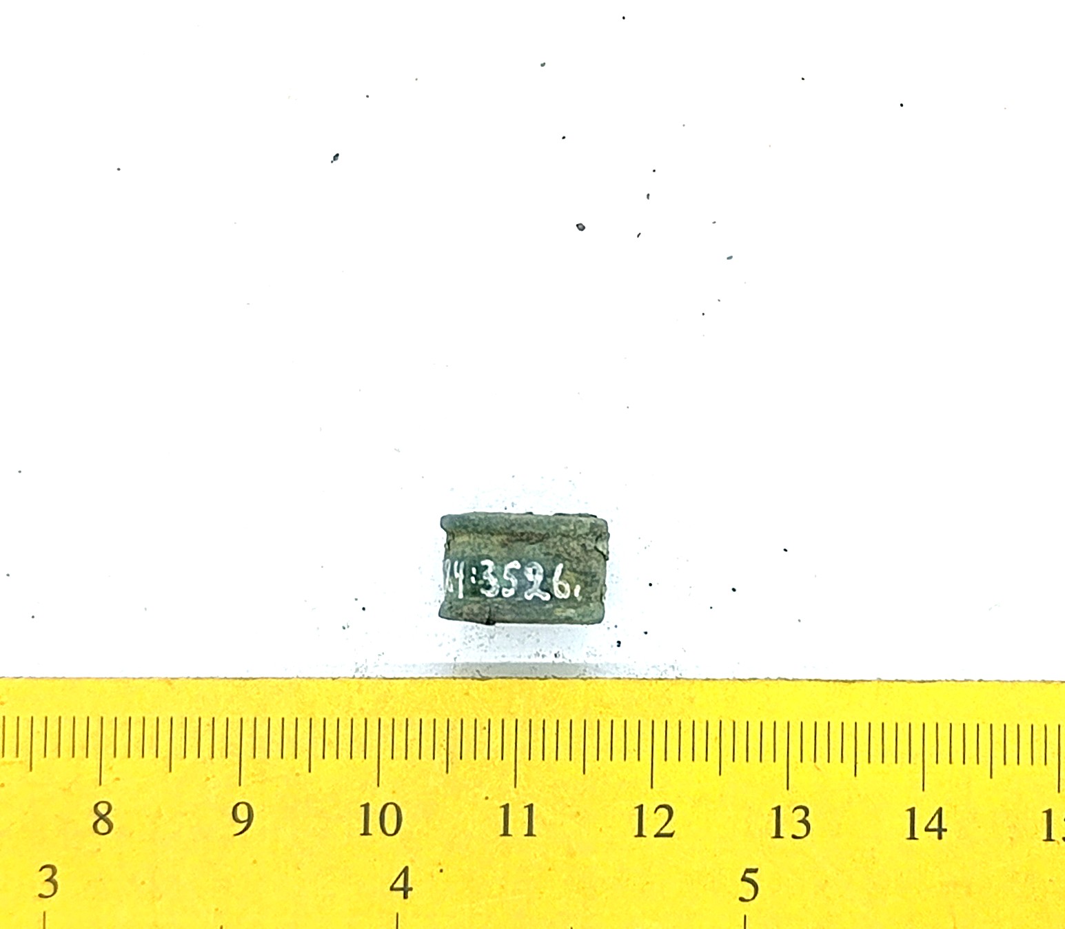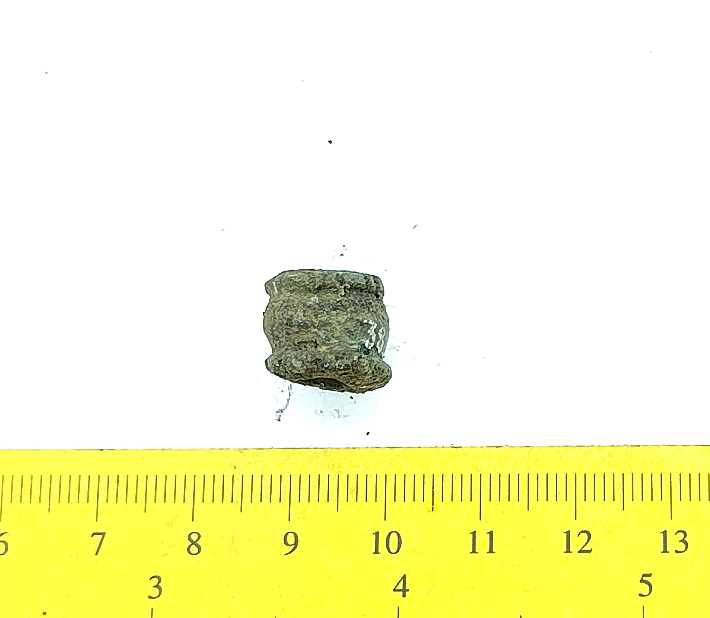 Bead, copper alloy. Bronze beads of this type have been found in stone graves with cremations (e.g. Mägi 2002, Pl. 13: 19–21) as well as inhumation burials dating to the 12th – 13th centuries (see Spirģis 2008, 421). In Estonia they are usually associated with belt ornaments.