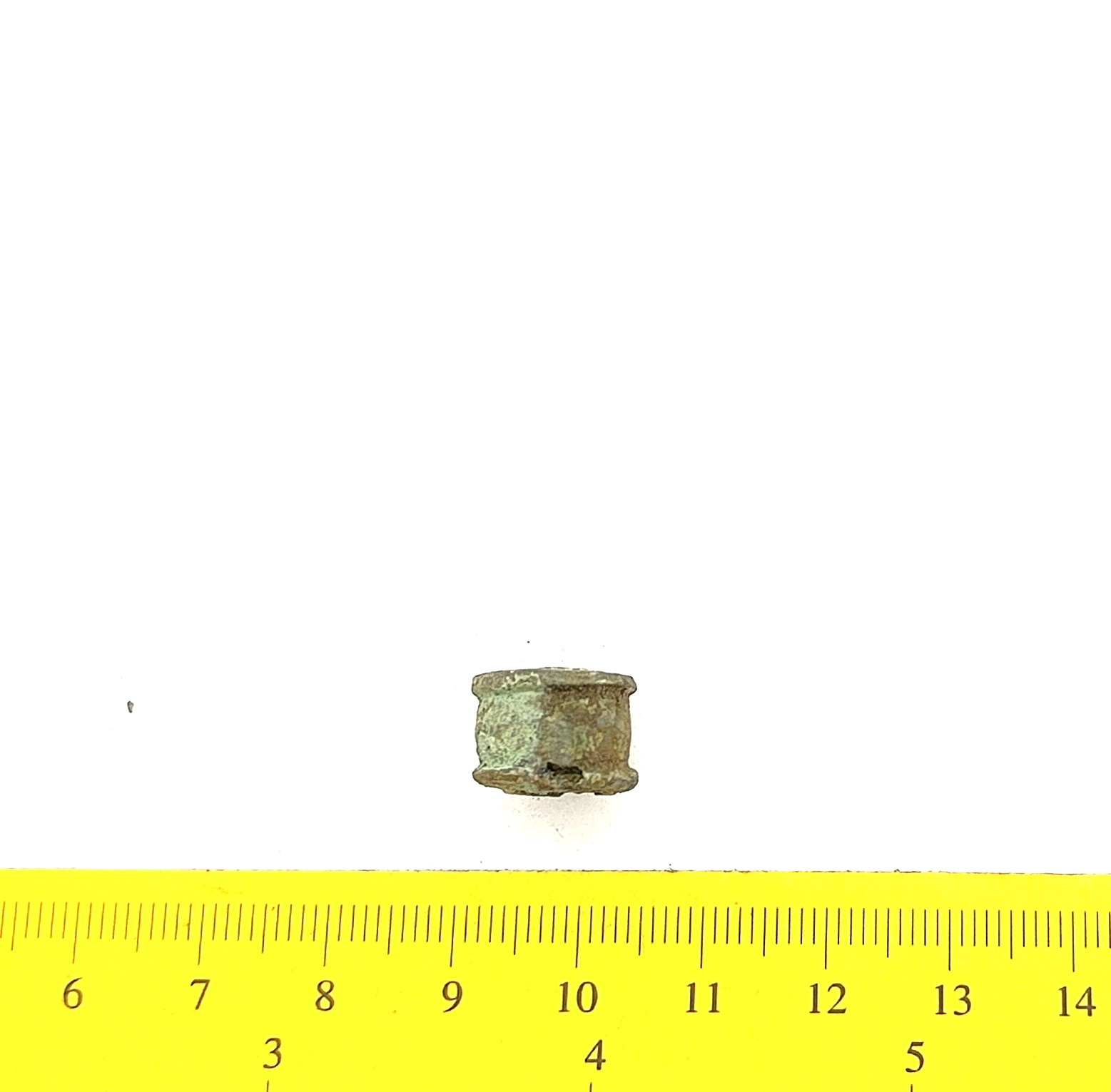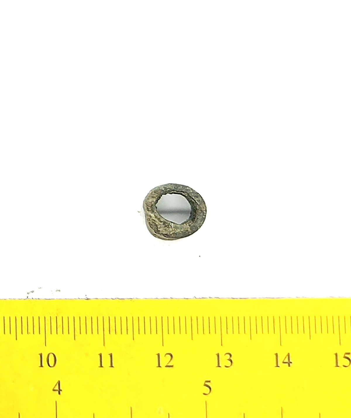 Bead, copper alloy. Bronze beads of this type have been found in stone graves with cremations (e.g. Mägi 2002, Pl. 13: 19–21) as well as inhumation burials dating to the 12th – 13th centuries (see Spirģis 2008, 421). In Estonia they are usually associated with belt ornaments.