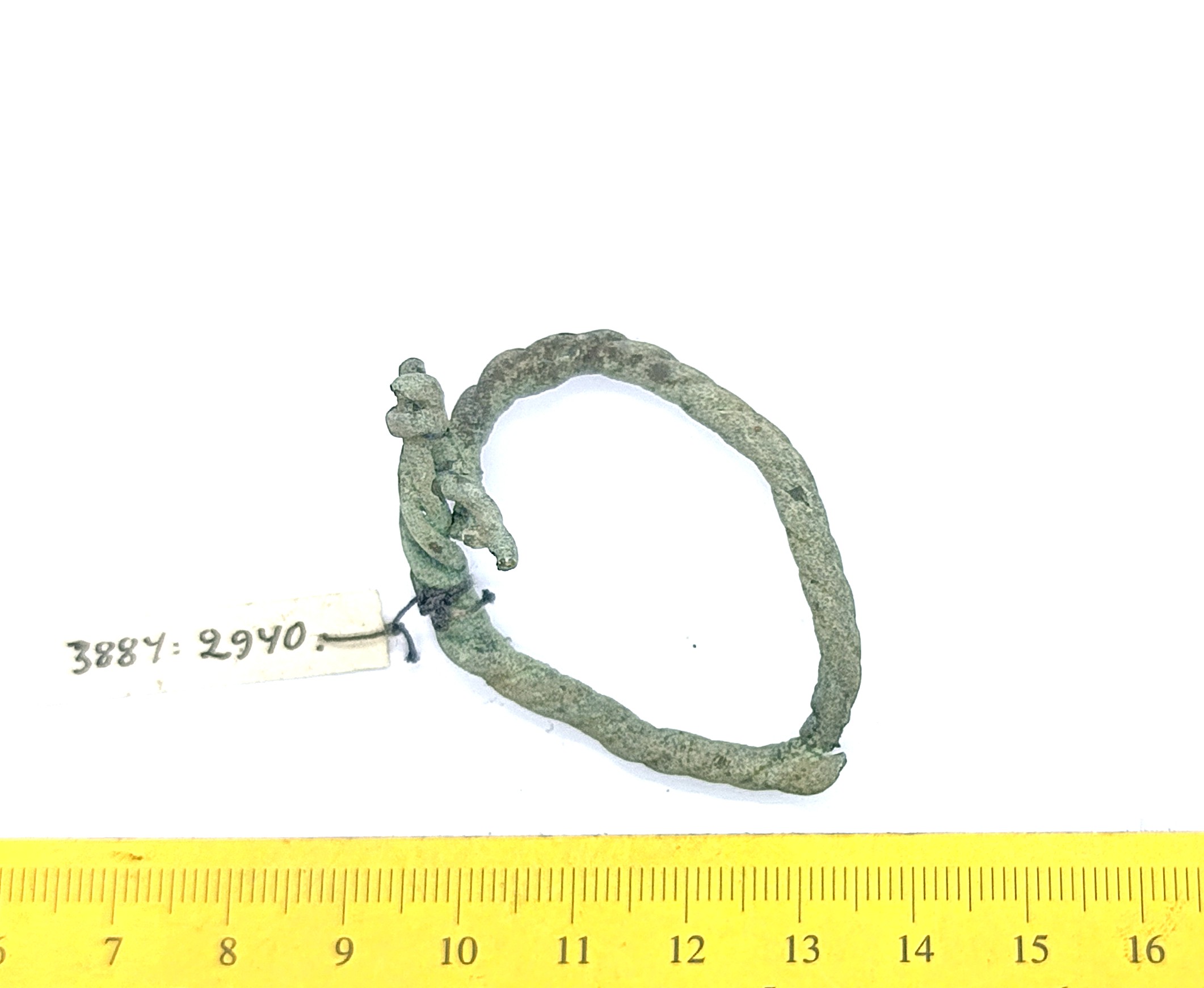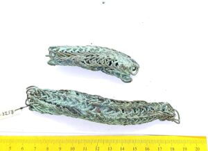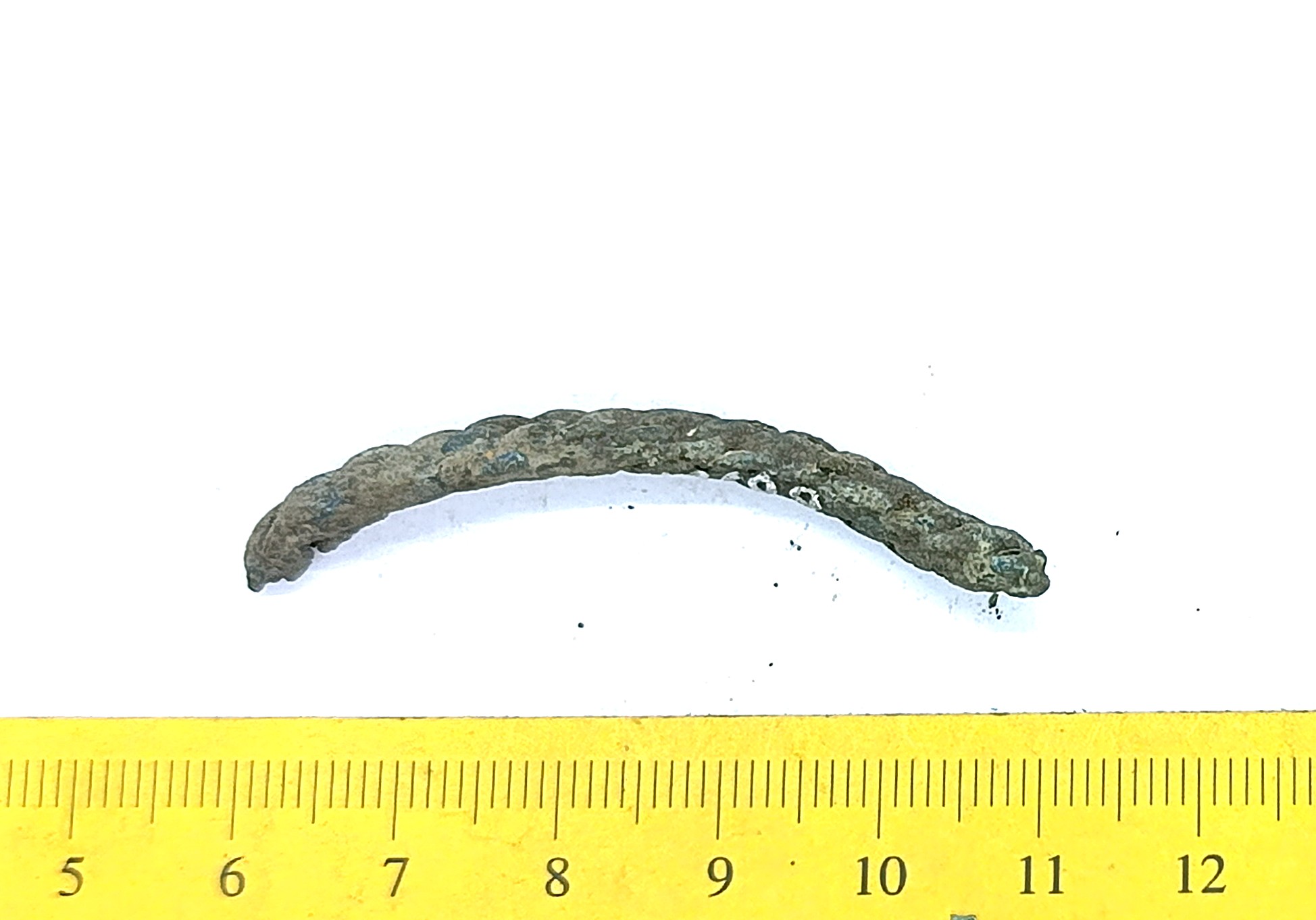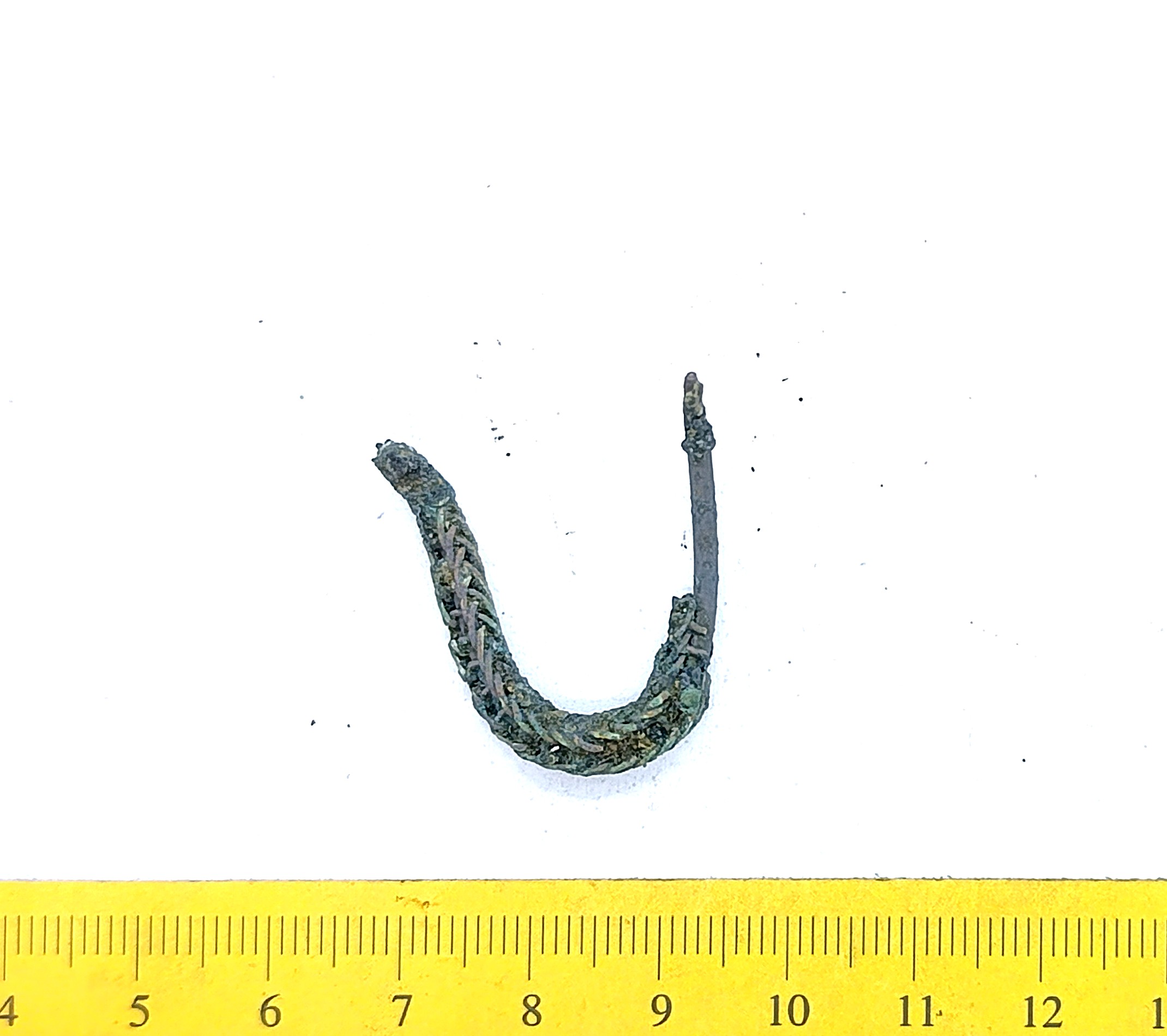 Fragment of the neck ring, copper alloy. Neck rings made of several twisted wires date back to the 12th -13th century and are one of the most common types of neck rings in the archaeological material of Saaremaa (Mägi 2002, 107). In Latvia, especially eastern Latvia, neck rings made of several twisted wires that had looped ends were worn already during the 11th––12th century (Zarina 2006, 246).