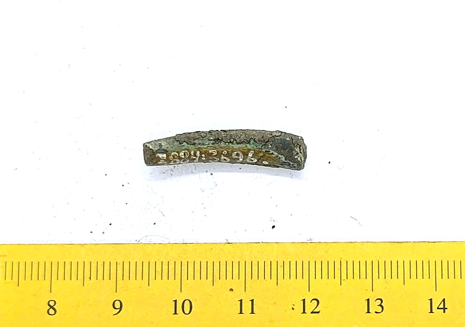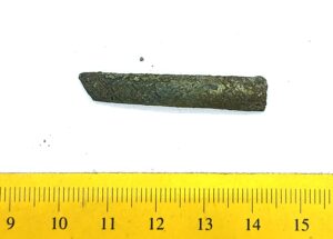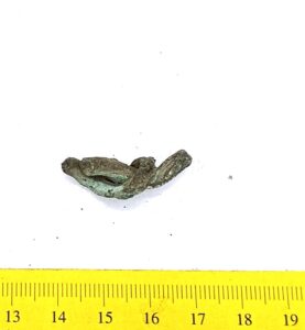 Fragment of a neck ring, copper alloy. Composite neck rings are usually assembled from three separate rings, using copper alloy clasps. This type of neck ring has only been found on Saaremaa (Mägi 2002, 107; 2019, 73). Similar finds have been obtained from Kurzeme, and they were also worn by Semigallians in the 10th–11th centuries (Tvauri 2014, 144; Griciuvienė 2005, 76-77).