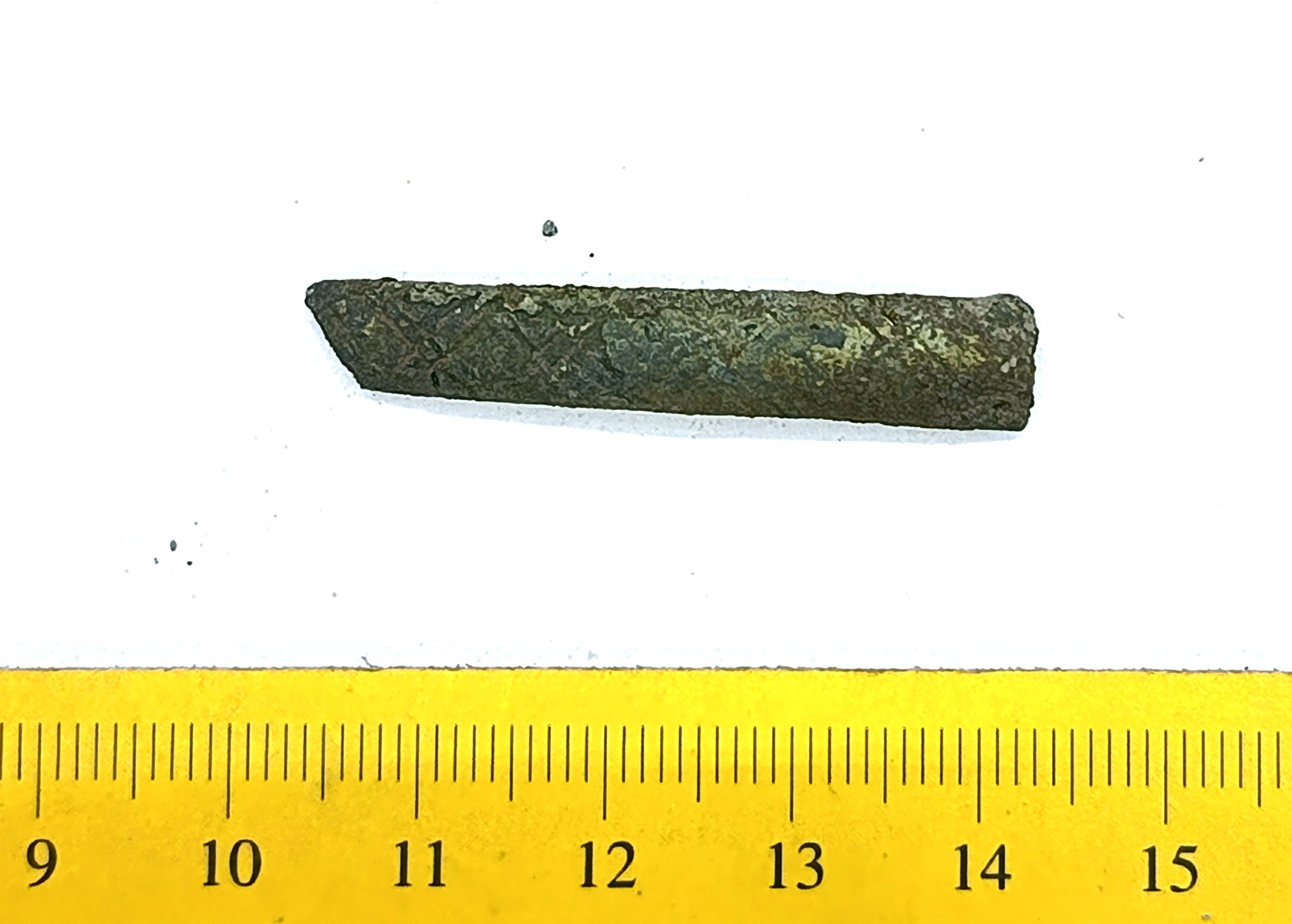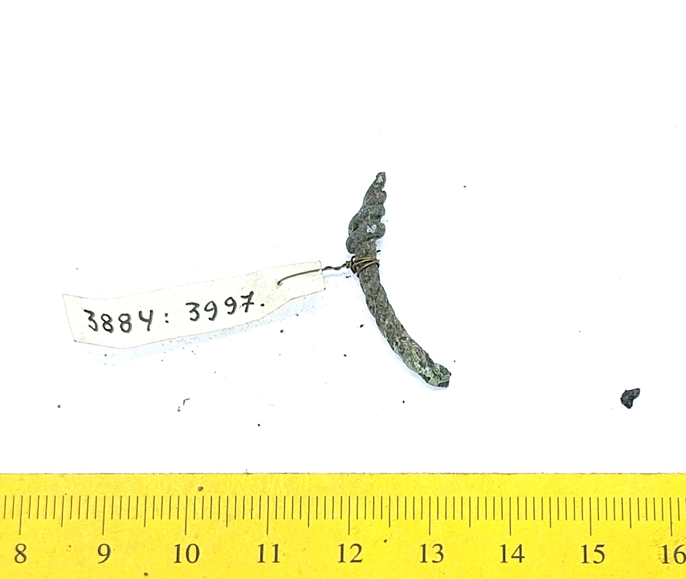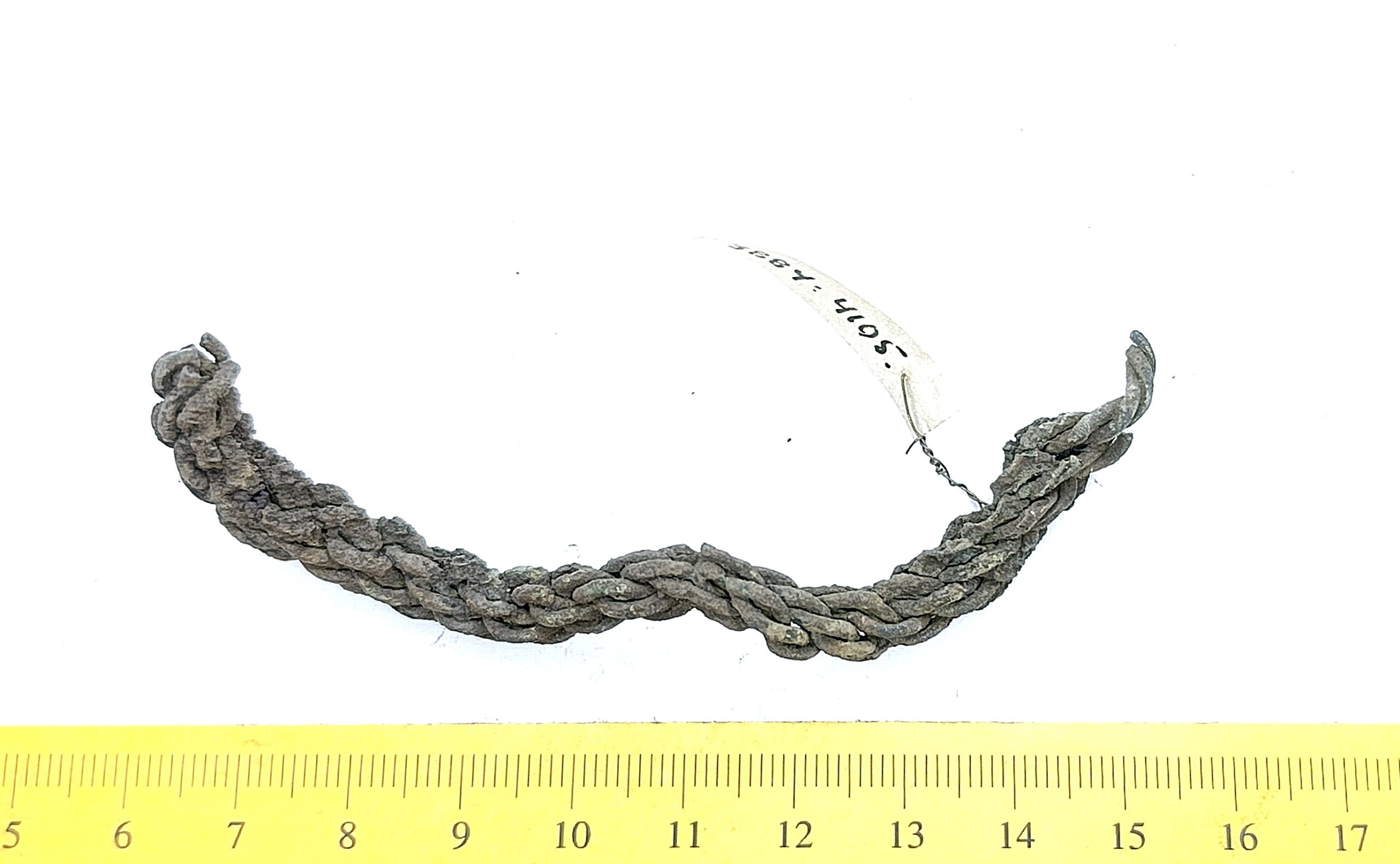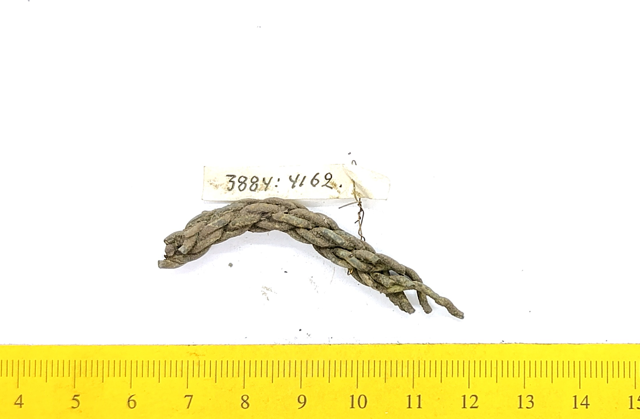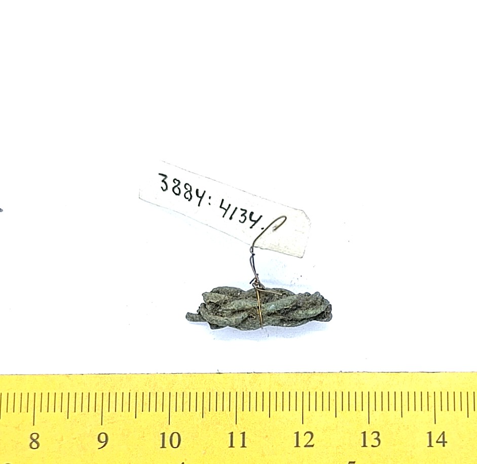 Fragment of chain woven of wires, copper alloy. Such chains were less common in Estonia than chains made of double-looped links. In Latvia, chains like these are associated with Scandinavian impact and are primarily dated to the 10th–11th centuries, sometimes to the 12th century (Spirģis 2008, 175).