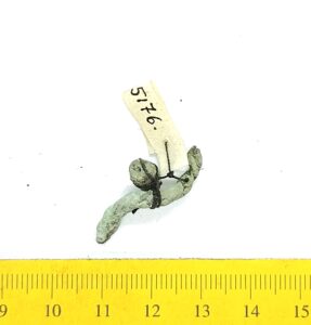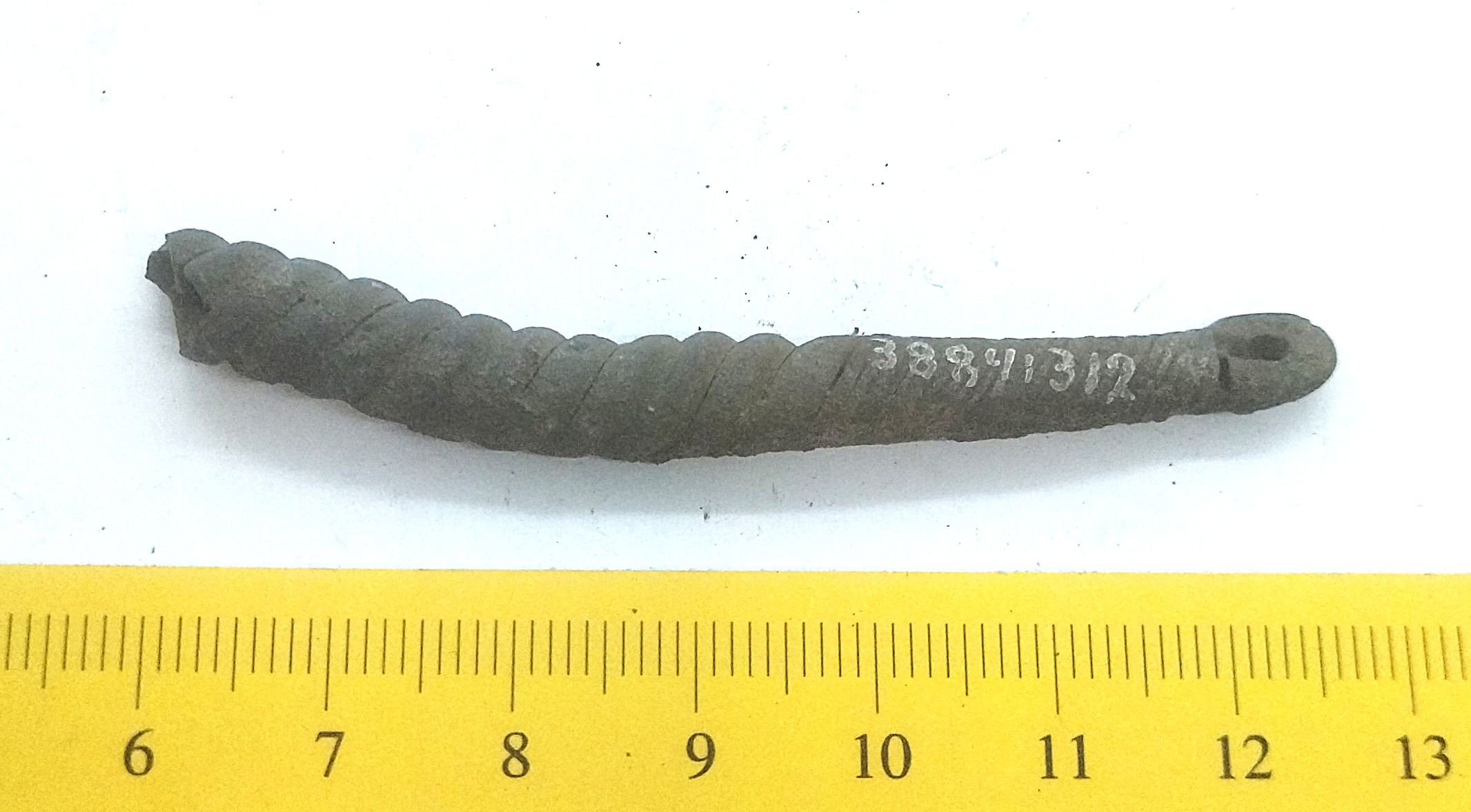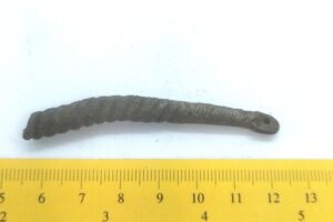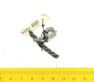 Fragment of a neck ring, copper alloy. Fragments of neck rings made of several twisted wires are common finds in Saaremaa stone graves with cremations. Since it is normally not possible to determine the exact type of these neck-rings, they can be dated to the whole period from the 10th to the 13th century (see also: Mägi 2002, 107).