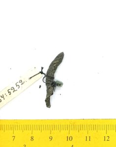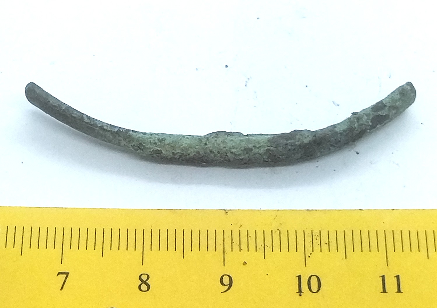 Fragment of a neck ring, copper alloy. Composite neck rings are usually assembled from three separate rings, using copper alloy clasps. This type of neck ring has only been found on Saaremaa (Mägi 2002, 107; 2019, 73). Similar finds have been obtained from Kurzeme, and they were also worn by Semigallians in the 10th–11th centuries (Tvauri 2014, 144; Griciuvienė 2005, 76-77).