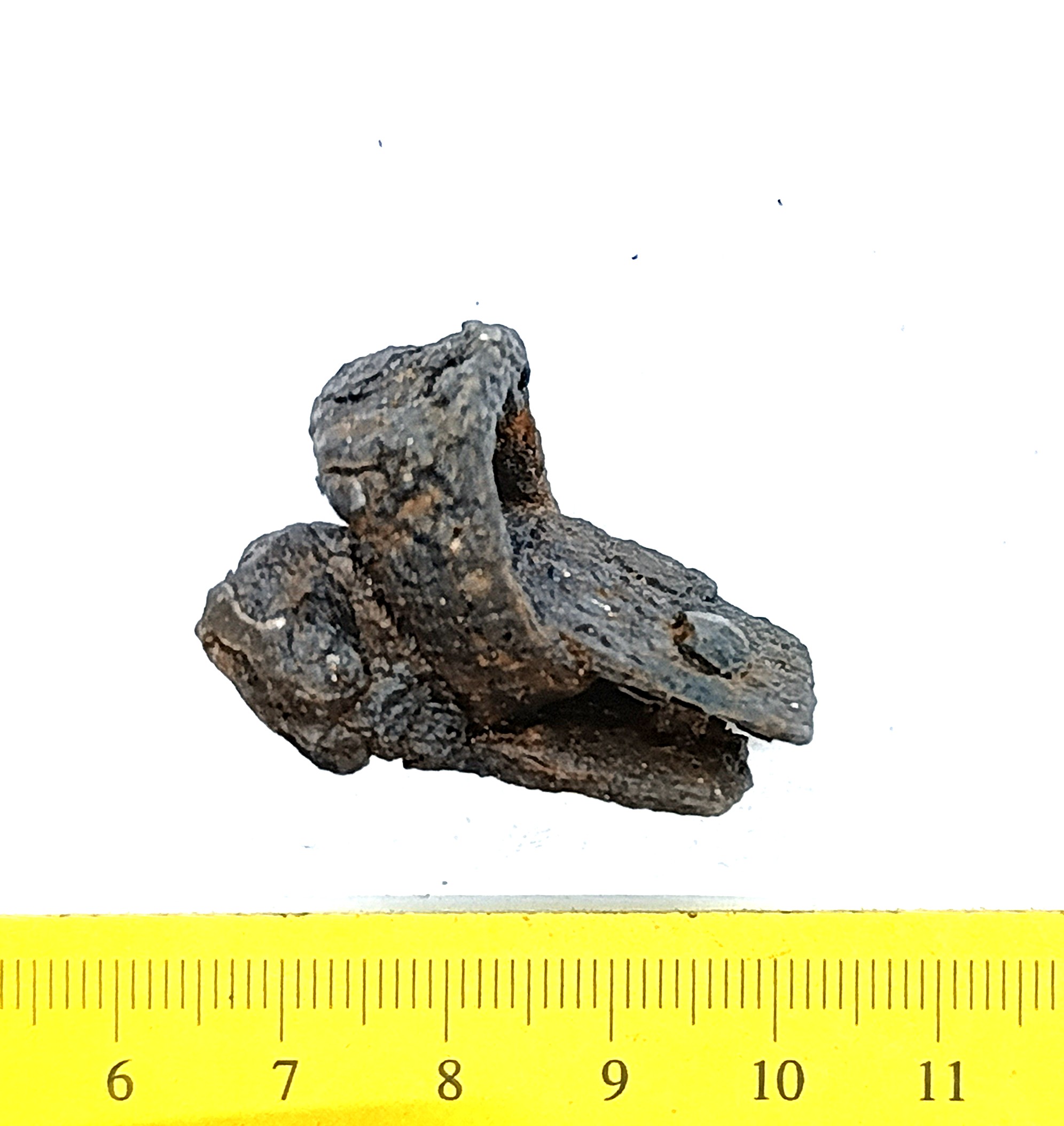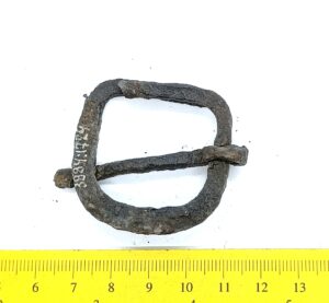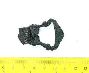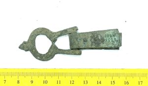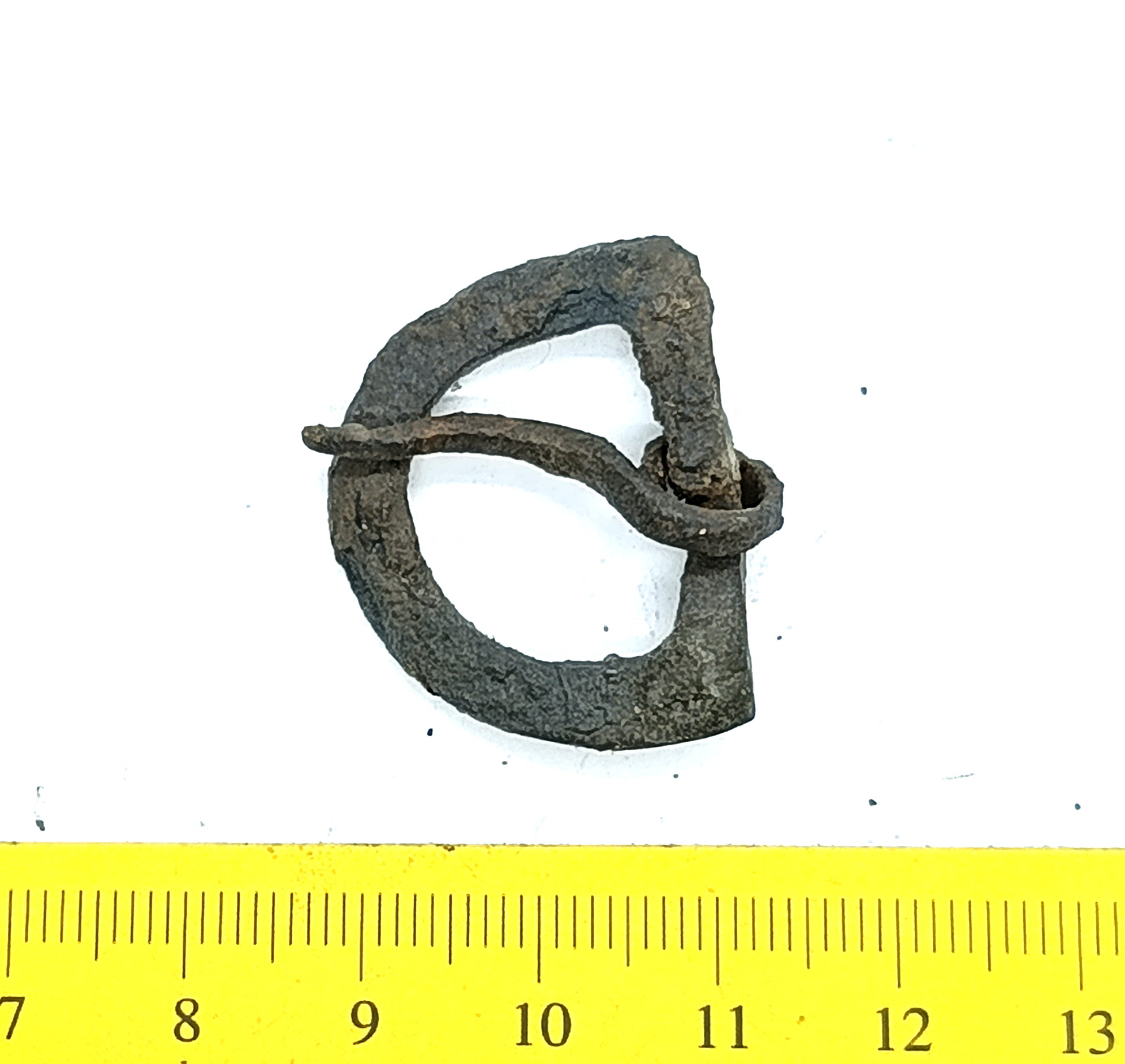 Gotland-Baltic type buckle, copper alloy. Previously the buckle type was believed to have developed in Gotland. Later data, however, shows that the buckle form could originate from the Baltics after which it was adapted in Gotland (Lehtsalo-Hilander 1982, 149–151; Mägi 2002, 97; for Gotlandic material see Thunmark-Nylen 1992, Pl. 127–129). The earliest buckles of this type belong to the second half of the 10th century, but the latest variants can also be found in the 13th-century inhumation graves (e.g. Zariņa 2006, 233-237). This specimen is probably the earlier variant.