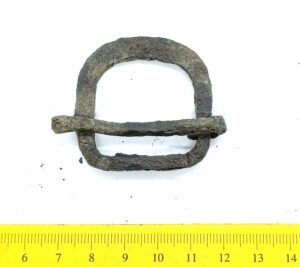 Buckle, iron. Perhaps part of bridles. This type of buckles usually includes a simple iron belt strap. They have been found mainly in stone graves and are not dated more precisely.