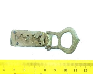 Gotland-Baltic type buckle, copper alloy. Previously the buckle type was believed to have developed in Gotland. Later data, however, shows that the buckle form could originate from the Baltics after which it was adapted in Gotland (Lehtsalo-Hilander 1982, 149–151; Mägi 2002, 97; for Gotlandic material see Thunmark-Nylen 1992, Pl. 127–129). The earliest buckles of this type belong to the second half of the 10th century, but the latest variants can also be found in the 13th-century inhumation graves (e.g. Zariņa 2006, 233-237).