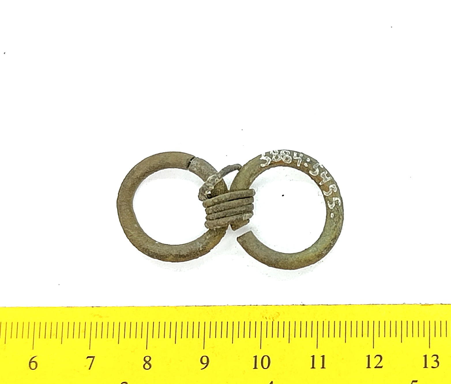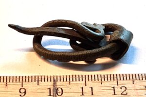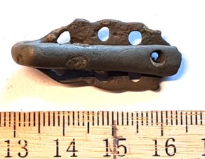 Belt-chain, copper alloy. The links of this belt-chain measure ~2 cm across and are held together by bronze links. Similar belt chains have been found in many Saaremaa inhumation burials dating to the 13th century, e.g. in Valjala (Mägi et al., 2019). Parts of belt-chains have also been found in stone graves with cremation burials where they can date to the 12th century.