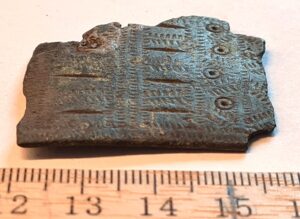 Chain distributer, copper alloy. From the 9th-13th century. Quadrangular chain distributors with protrusions are a typical component of the breast chains placed in the 13th-century inhumation burials of Estonian women, but they are also abundantly found in earlier stone graves and as stray finds. They have been discovered throughout areas inhabited by Baltic Finnic peoples, as well as elsewhere, for example in Semigallia. (Spirģis 2008, 168–170).