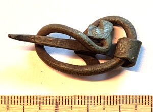 Penannular brooch, copper alloy. With stylised lily-shaped terminals, a pin with a widening foot, and the central part of the bow grooved on the upper side. Twisted together. In Siksälä, a somewhat similar example is known from burials CCXLIV and CCXLIX, which are dated to the 14th century, primarily its first half (Valk et al 2014, 158, 272). Quite similar ones are also known from Courland, from the Laukmuiža cemetery at Dundaga, where the burials are dated to the late 13th or early 14th century(e.g. Muižnieks & Žeiere 2021, drawing 7:3, 7).