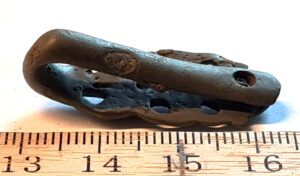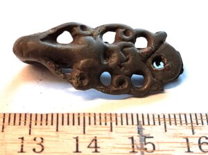 Animal style joining mount, copper alloy. Such examples are very widespread in the material from the coastal regions of Estonia, Finland, and Latvia (Jets 2012, 166-178). They belong predominantly to the 11th–12th centuries, although they may have appeared already in the late 10th century. Individual strap-ends of this type have also been found in 13th-century inhumation burials; however, in those contexts they are likely older objects than the rest of the grave goods (nt. Mandel 2017, 39, tahv. X).