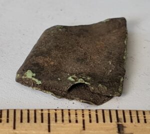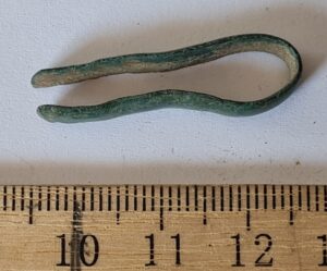 Mount, copper alloy. Bent double; one end is saw-edged, but it is not a typical saw-edged mount. More precisely undetermined.