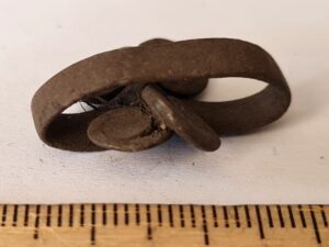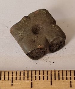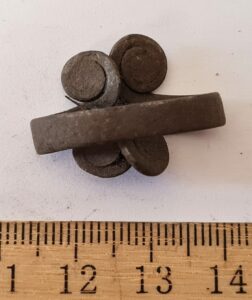 Cubic chain distributer, copper alloy. Chain distributors held together belts composed of metal rings, which have been found in several 13th-century inhumation burials, for example at Valjala (Mägi et al. 2019, 98–99). Such chain belts have been recovered mainly from women’s and children’s graves, and both the chains and the associated cubic chain distributers have been dated to the 12th–13th centuries (Kurisoo et al. 2023, 220–221).