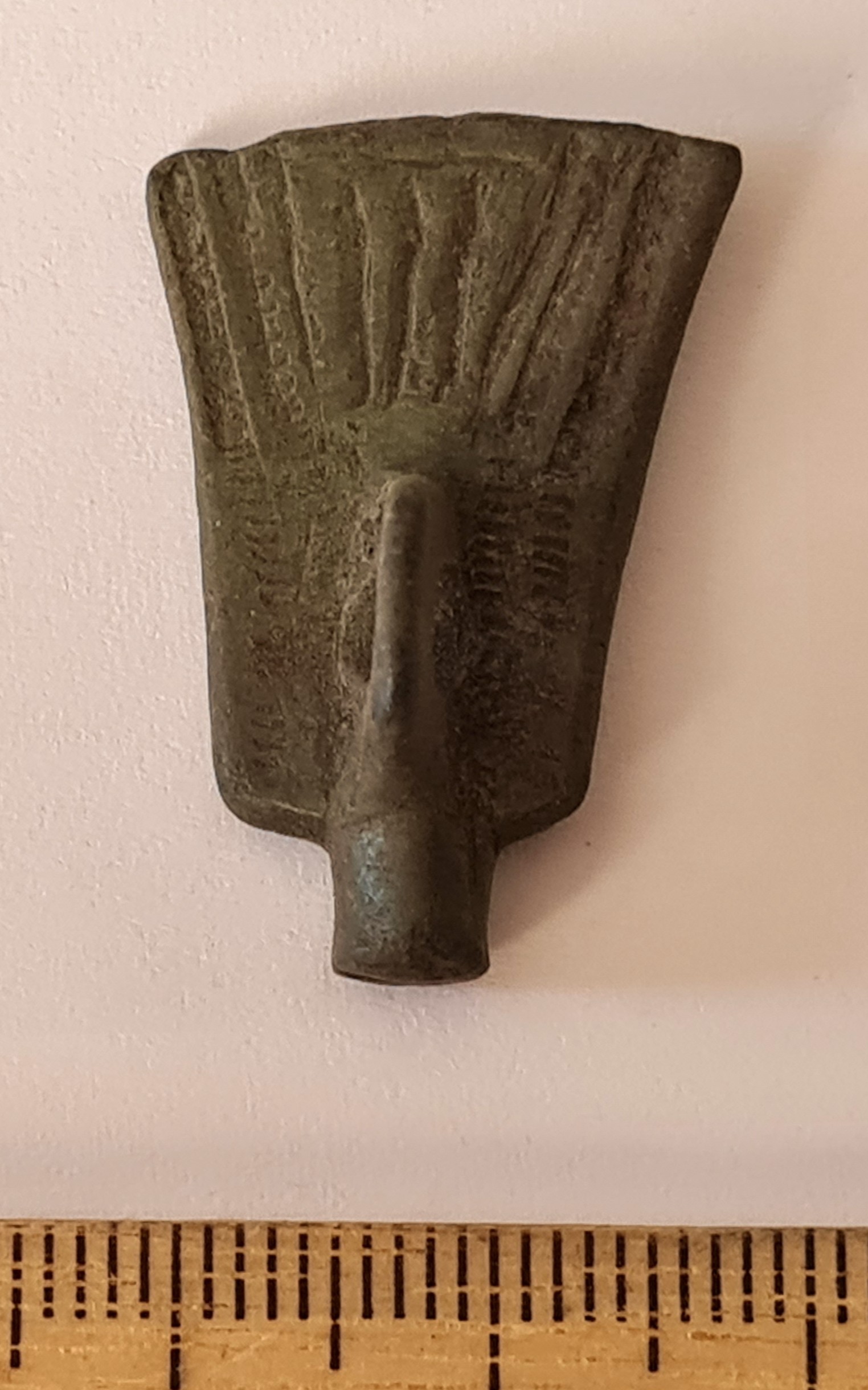 Fragment of Saaremaa type flat triangular-headed pin, copper alloy.