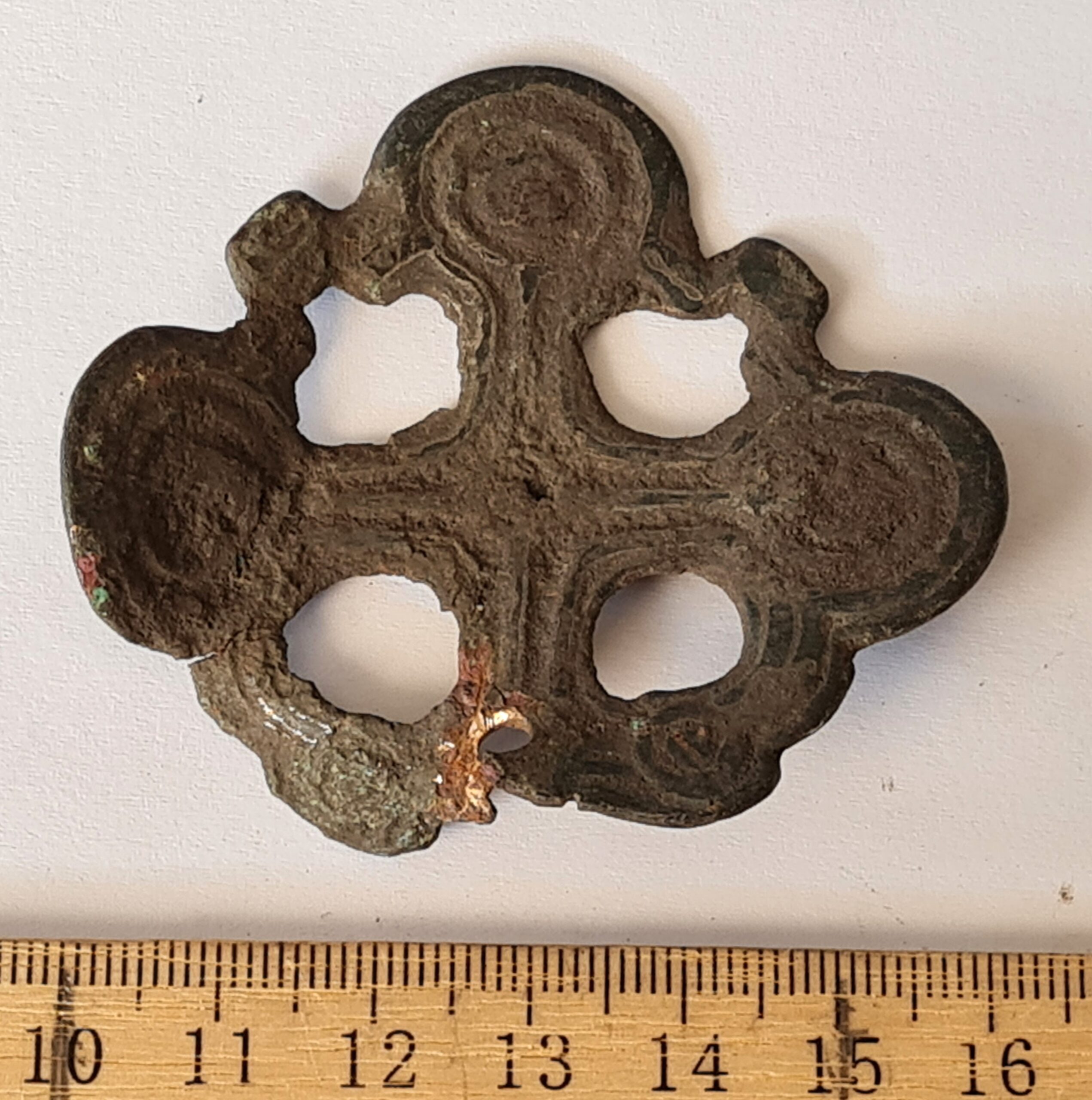 Two fragments of artefact, copper alloy. One of them is the base-plate of mount.