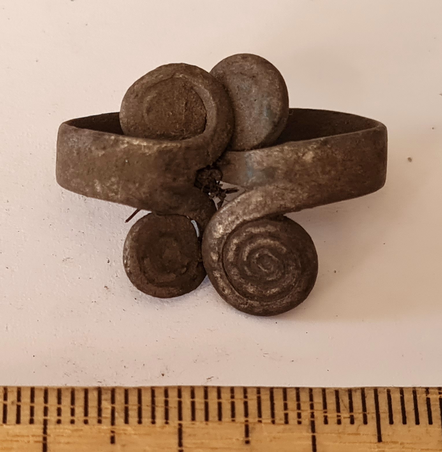 Finger-ring with double-spiral ends, copper alloy.