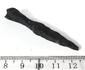 Arrow-head, iron. Most likely crossbow bolt. With a pyramidal head, the greatest width at the base of the blade where it transitions to the socket – Mäesalu type A I. Comparable examples have been found, for instance, at the Varbola hillfort (e.g. AI 3864: 1; 5299: 23, 305). Crossbows came into use in the Baltic region already at the very end of the 12th century, but heads of the present type are dated in Estonia mainly to the first half of the 13th century (Mäesalu 1991). In Latvia, such crossbow bolt heads are dated from the late 12th century to the early 14th century (Mugurēvičs 2008, 202).