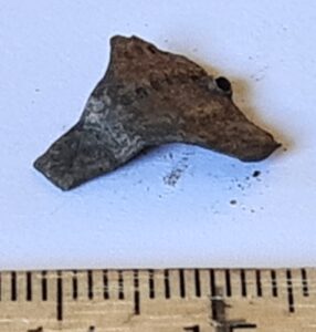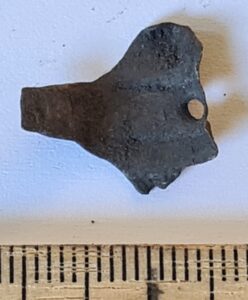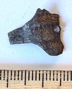 Fragment of finger-ring with middle shield, copper alloy. In Siksälä, such examples have been found mainly in burials dating to the late 13th or 14th century (e.g. Valk et al 2014, 27). In any case, they should not be earlier than the mid-13th century, but they may also date as late as the 15th century (Valk & Laul 2014, 118).