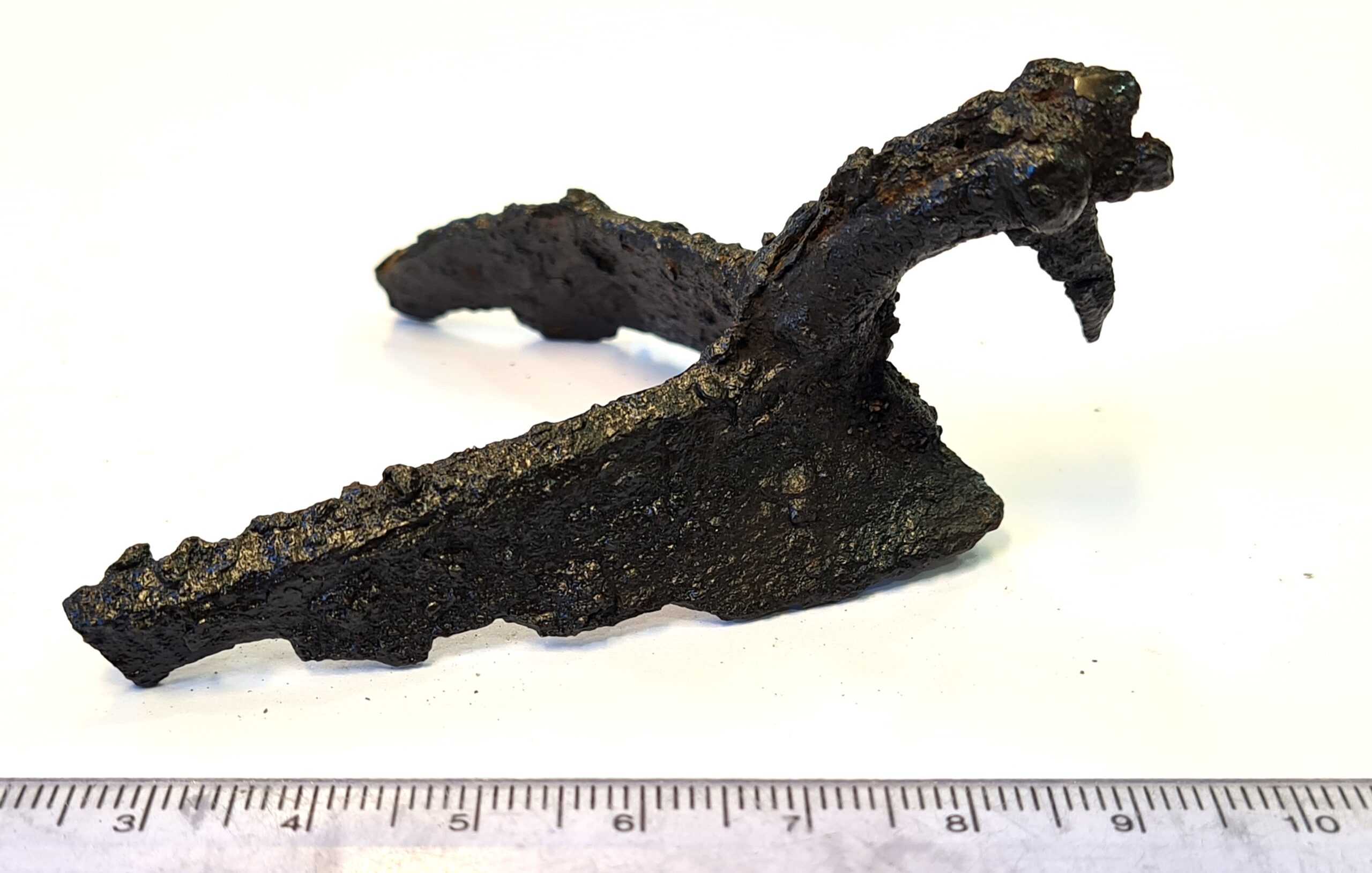 Spur, iron. The spur is broken and heavily rusted, but it is probably the type with the spiked disc.