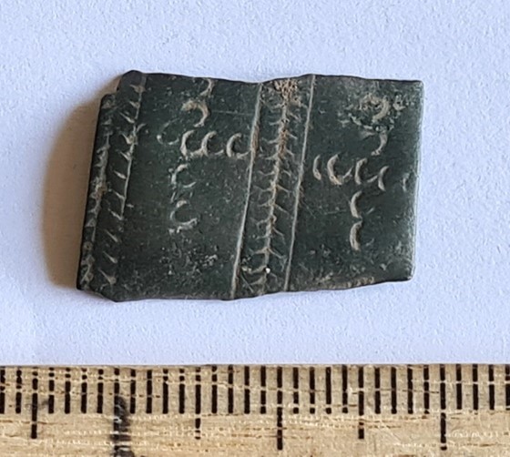 Fragment of a bracelet, bronze. Probably a hollow bracelet with narrowing ends, as found in 13th-century inhumations in Saaremaa (Mägi et al 2019, 97). Fragment with typical ornamentation.