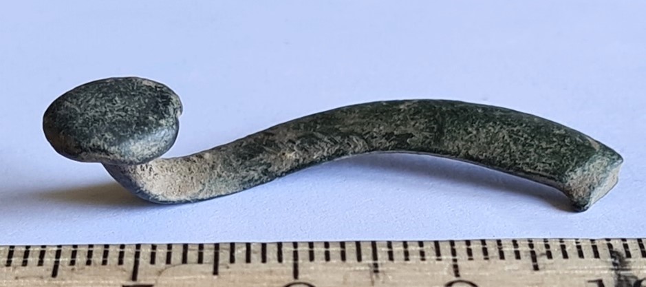 Fragment of penannular brooch with lily-shaped terminals, copper alloy. Such brooches are known from medieval inhumations in Couronia, where they are dated from the second half of the 14th century to the third quarter of the 15th century (Vaska 2017, 62-64).