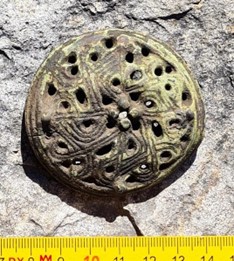 Disc-shaped brooch, copper alloy. Finnish, but recently more and more of these have been found in Estonia. Probably type C, defined by Appelgreni and dated by Pirkko-Liisa Lehtosalo-Hilander to the period 925-975. (Moilanen 2020).