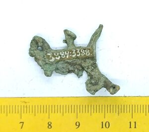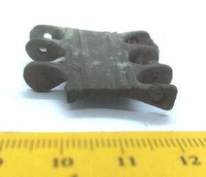 Flat belt mount, copper alloy. Mounts of this type are commonly found in Osilian stone graves with cremations, where they can be dated mainly to the 12th century (e.g. Rahu and Randvere). They are also associated with Courians, Livs and Semgallians.