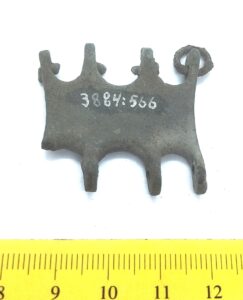 Flat belt mount, copper alloy. Mounts of this type are commonly found in Osilian stone graves with cremations, where they can be dated mainly to the 12th century (e.g. Rahu and Randvere). They are also associated with Courians, Livs and Semgallians (Mägi 2002, 98; Pl. 52: 4–6; 66: 8; 70: 10–11, etc.).