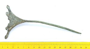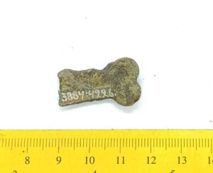 Double cross-headed pin with connected terminals, copper alloy. Such pins are mainly found in inhumations from the 13th-century but were possibly taken into use as early as in the end of the 12th century (see also Mägi et al. 2018, 94, Fig. 14: 1).