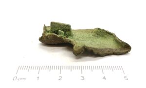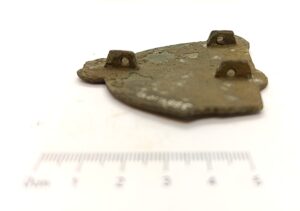 End plaque of a chain arrangement, copper alloy. These types of end plaques were widespread in Saaremaa and coastal Estonia, but also in the Livic areas and northern Couronia, where they have been dated 950–1150 (Zariņa 2006, 363; Spirģis 2008, 427). Most of such plaques seem to belong to the 11th century (Mägi 2019, 75). As demonstrated in Livic inhumation burials, they have additionally fixed the chain arrangement in the front part of the bearer (Zariņa 2006, fig. 196: 1, 189: 2).
