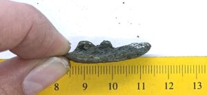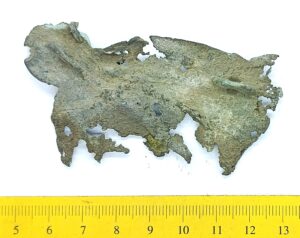 Saaremaa type chain holder, copper alloy. Semi-oval, partly melted. Most likely has been silver-plated. It is a typical chain holder of Saaremaa, also found in northern and western Estonia, with a few examples in the surrounding areas. They can be found in both cremations and inhumation burials, often together with pins of Saaremaa type. Similar chain holders are also known from the Livic areas in Latvia, where they have often been uncovered in inhumation graves together with other Saaremaa-type artefacts (Spirgis 2008, 144-145). Although previously dated to the 11th century, they were probably mainly in use in the 12th-13th centuries (Mägi 2002, 105).