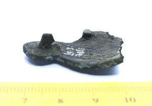 Saaremaa type chain holder, copper alloy. Semi-oval. It is a typical chain holder of Saaremaa, also found in northern and western Estonia, with a few examples in the surrounding areas. They can be found in both cremations and inhumation burials, often together with pins of Saaremaa type. Similar chain holders are also known from the Livic areas in Latvia, where they have often been uncovered in inhumation graves together with other Saaremaa-type artefacts (Spirgis 2008, 144-145). Although previously dated to the 11th century, they were probably mainly in use in the 12th-13th centuries (Mägi 2002, 105).